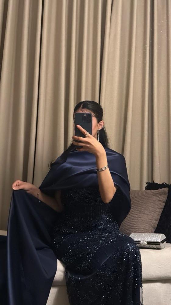 استعدي للتألق في المناسبات الكبيرة وحفلات الزفاف مع فستان ايفان . يأتي هذا الفستان بلون كحلي أنيق ومتألق، مما يضفي لمسة من الجمال والرقة على إطلالتك. الفستان مكون من قطعتين، حيث يتميز بذيل من قماش التفته الحرير الفاخر ، بينما يتميز اللبس الفستان بقماش من التل المطرز بالخرز بطانه من التفته الحرير أيضا