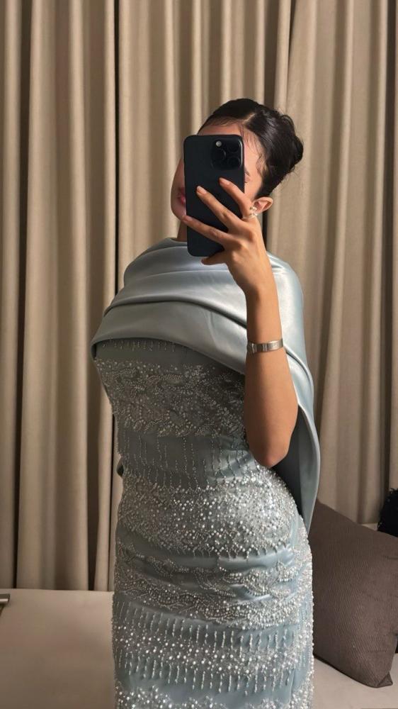 استعدي للتألق في المناسبات الكبيرة وحفلات الزفاف مع فستان ايفان . يأتي هذا الفستان بلون تيفاني أنيق ومتألق، مما يضفي لمسة من الجمال والرقة على إطلالتك. الفستان مكون من قطعتين، حيث يتميز بذيل من قماش التفته الحرير الفاخر ، بينما يتميز اللبس الفستان بقماش من التل المطرز بالخرز بطانه من التفته الحرير أيضا