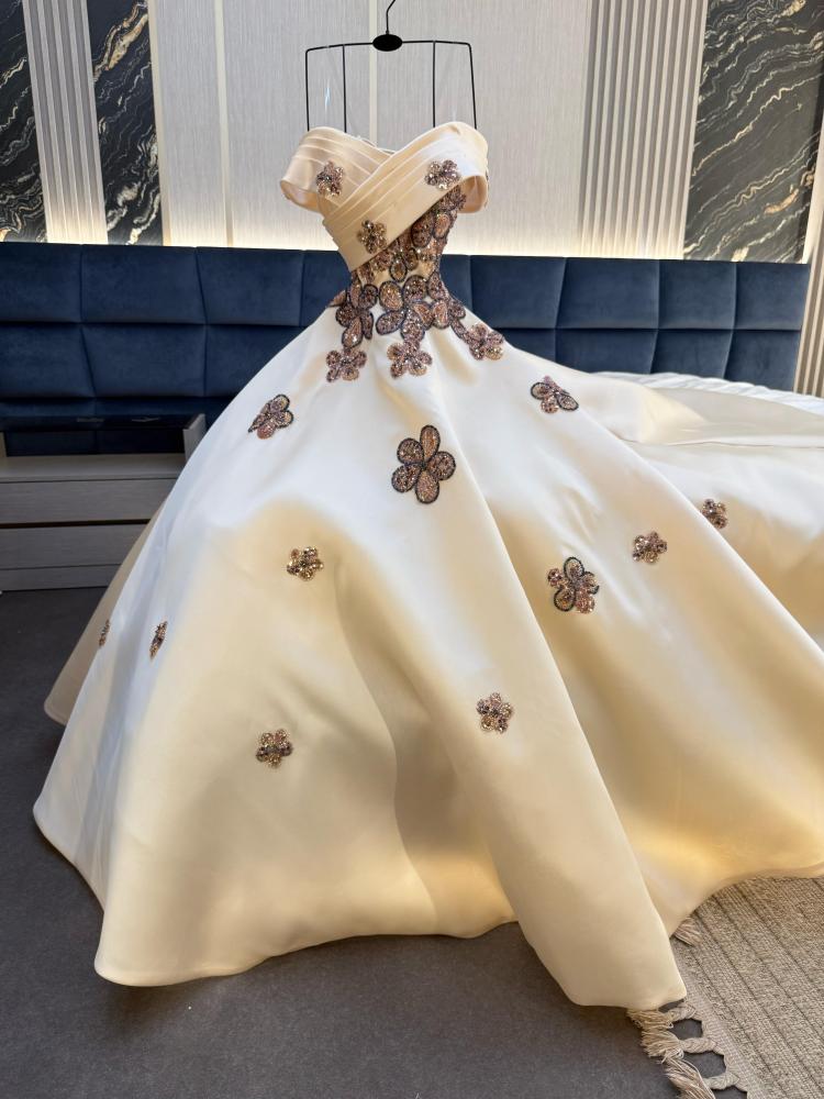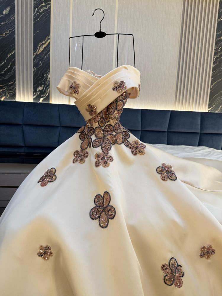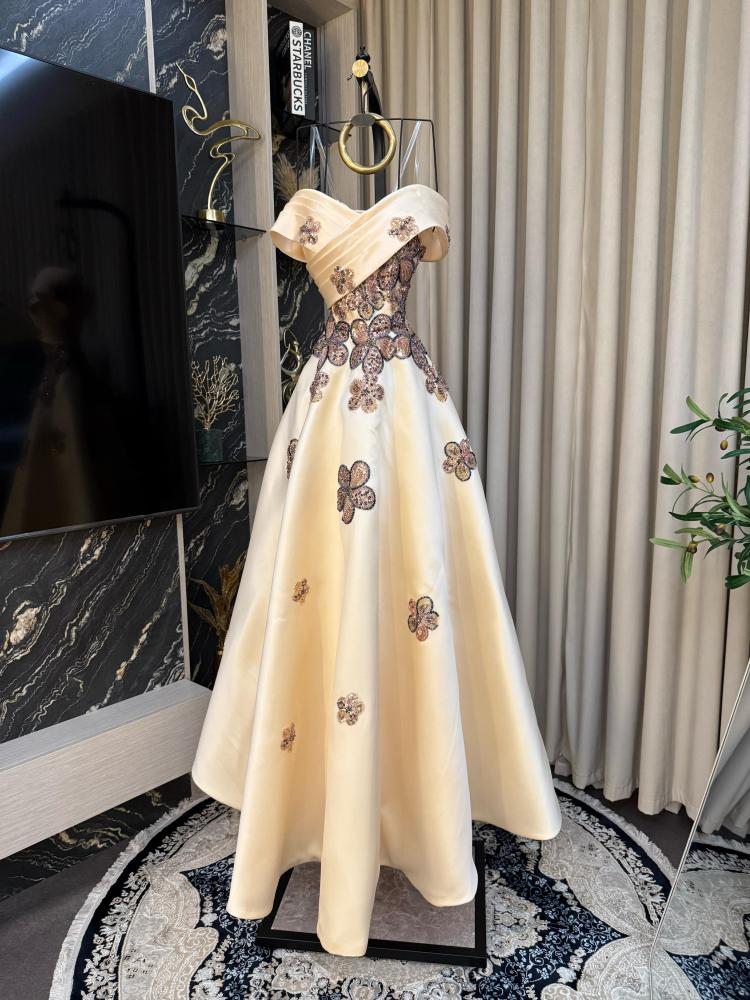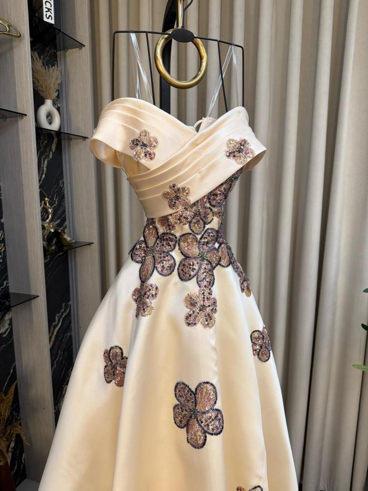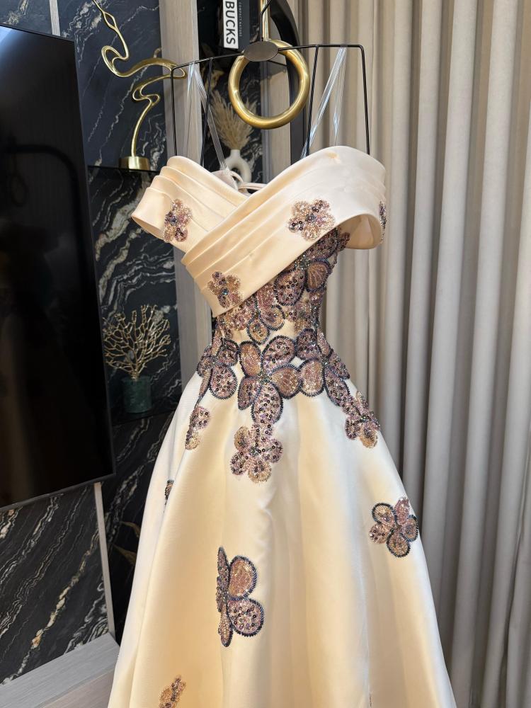 نوع القماش: ميكادو بتطريز خرز وشك اللون: بيج الطول: 160 سم السعر: 485 ريال
