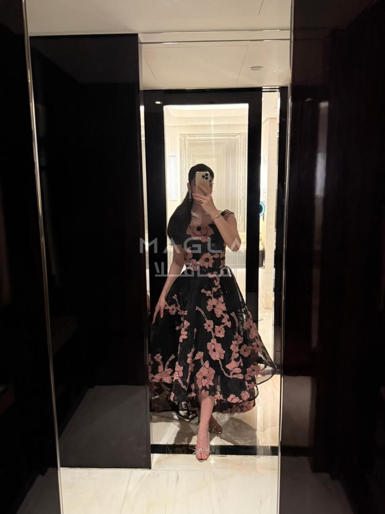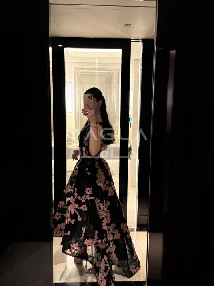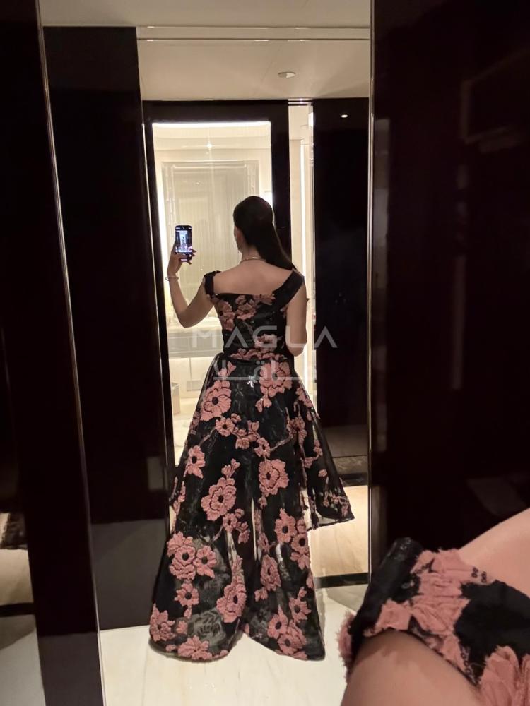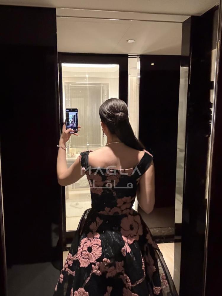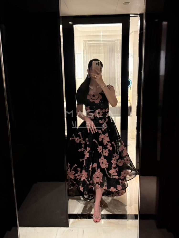 أماسـي تيور سهرة فاخر بتصميم ملكي من خامة جازار لمعة، بقصة دبل كلوش واسعة مطرزة بـ خرز فاخر مع تدخيلة ورود شيفون بارزة تضيف لمسة أنثوية حالمة. يأتي باللون الأسود الكلاسيكي مع تطريز بيبي بينك يمنح تبايناً أنيقاً وفخامة استثنائية.