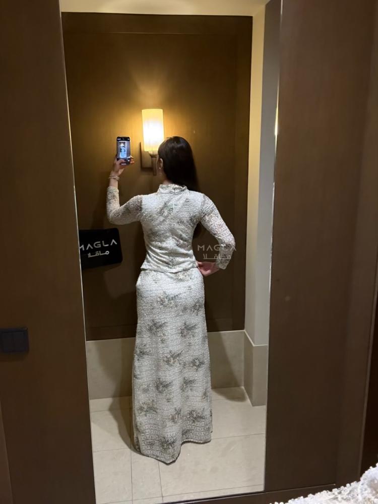 إطلالة راقية تجمع بين الهدوء الكلاسيكي والتفاصيل اللامعة بخيوط الخرز، مثالية للسهرات الراقية أو المناسبات الرسمية.