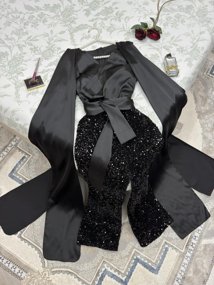 جمبسوت بساق واسع بلونه الاسود هو خيار مثالي للسيدات اللواتي يسعين للحصول على إطلالة أنيقة وأنثوية في المناسبات الخاصة مثل الزواج والمناسبات والخطوبة. تم تصميم هذه الجمبسوت بقصة اوفر سايز أنيقة ومتطورة، تجمع بين الأناقة والراحة.