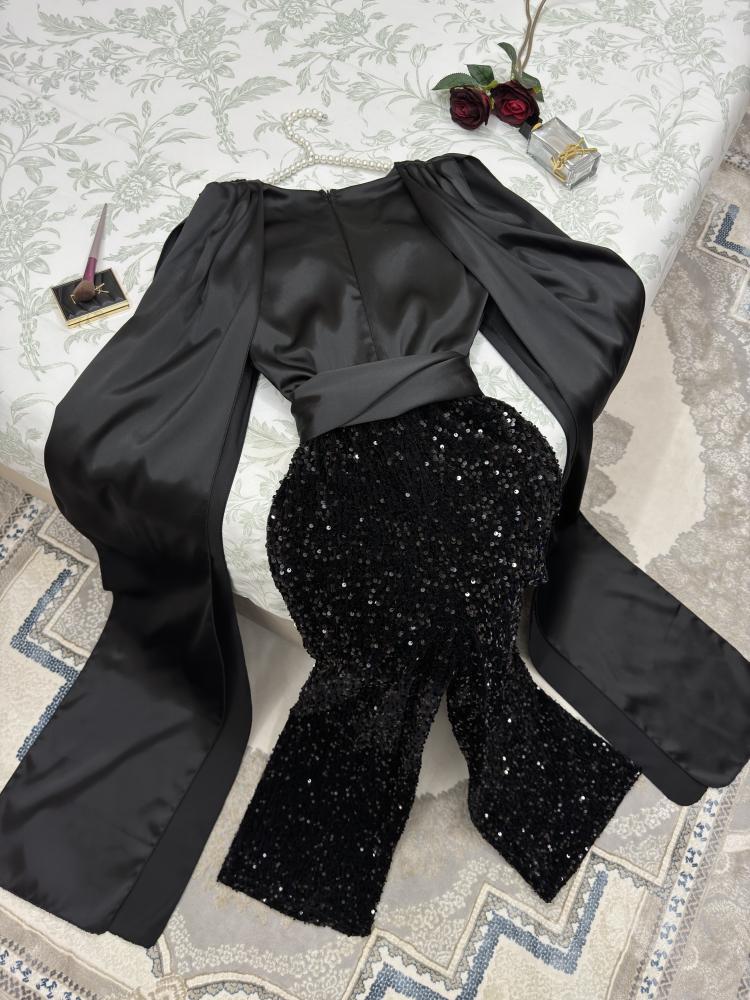 يتميز الجمبسوت بلونه الاسود ، الذي يعكس الرقي والأناقة ويتناسب مع مختلف أنواع الإكسسوارات والمجوهرات. تم استخدام قماش التفته الفاخر مع تدخيلة ترتر في صناعة هذه الجمبسوت، الذي يوفر ملمسًا ناعمًا وراحة ممتازة وملفت للأنظار أثناء الارتداء.
