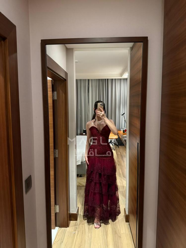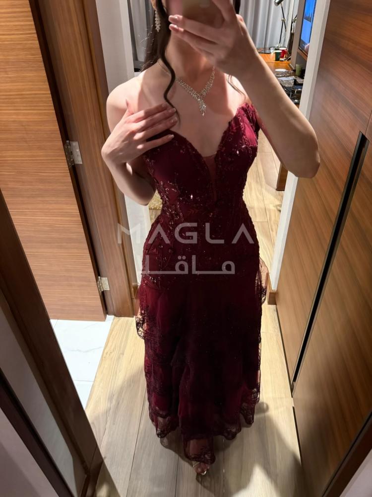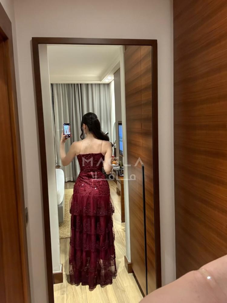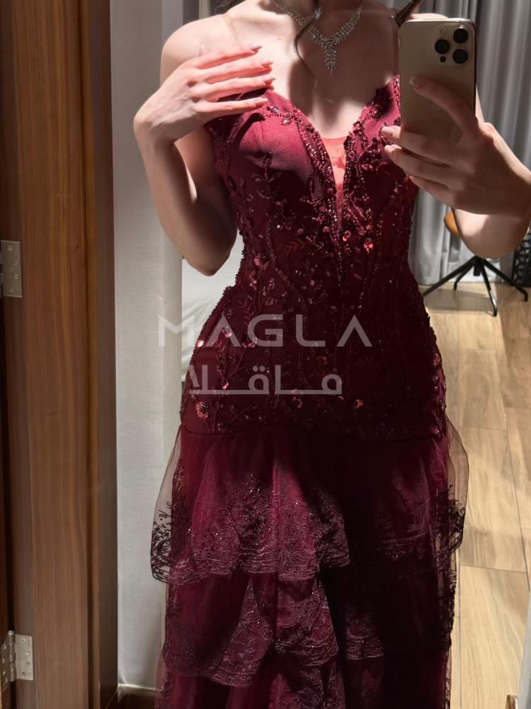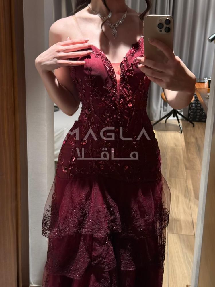 بتدرجات اللون البرغندي المخملي، يسطع "سولينار" كقطعة استثنائية تخطف القلوب والأنظار. يأتي تصميم الصدر من قماش التفته الراقي، مزين بأجمل تطريزات الخرز والترتر التي تعكس الضوء ببريق ساحر، بينما تنسدل التنورة من **تل ناعم مزدان بدانت