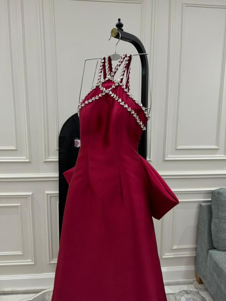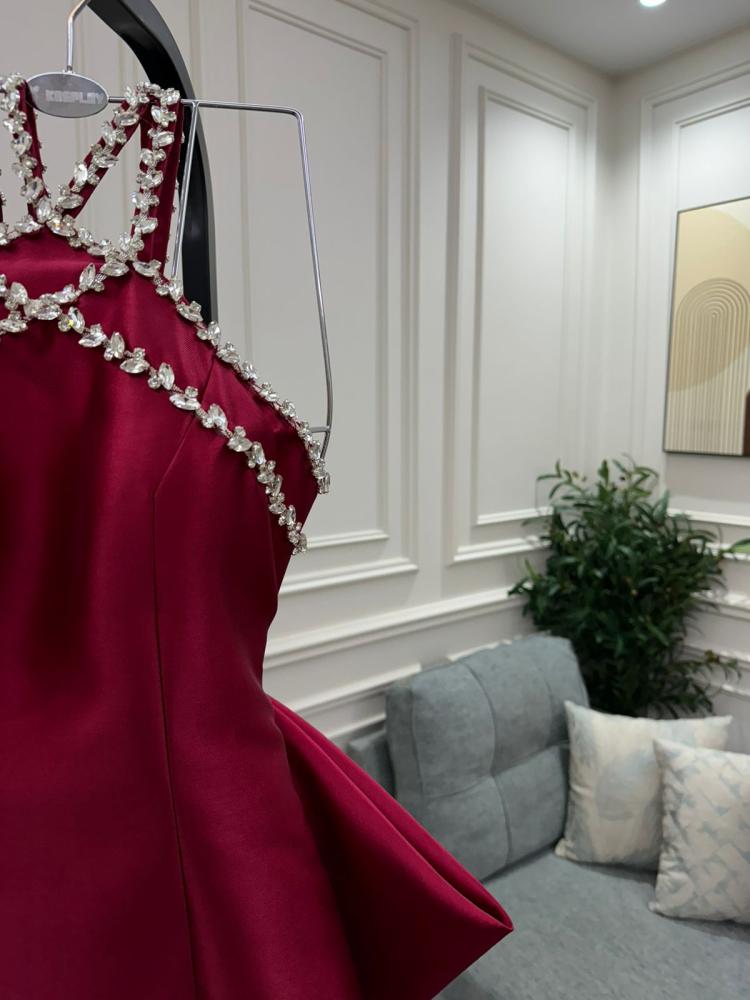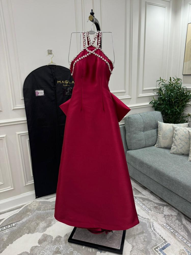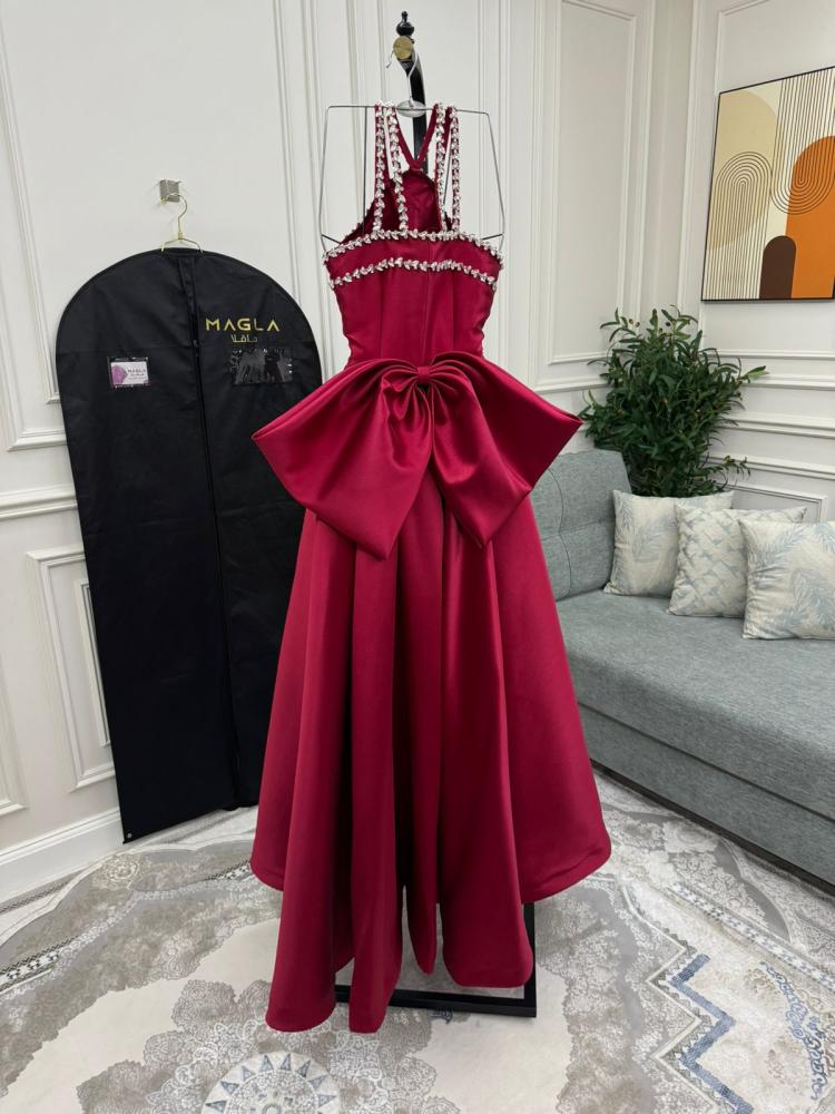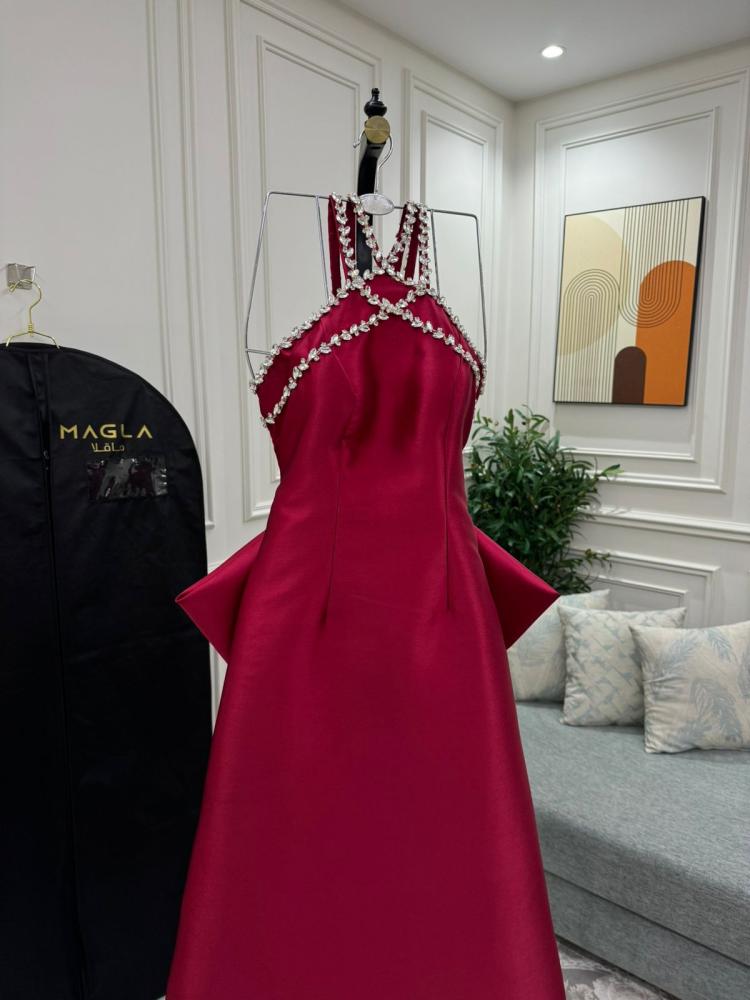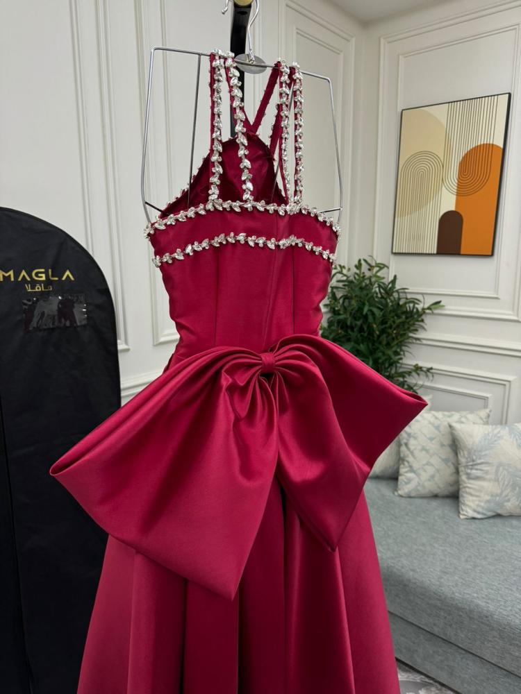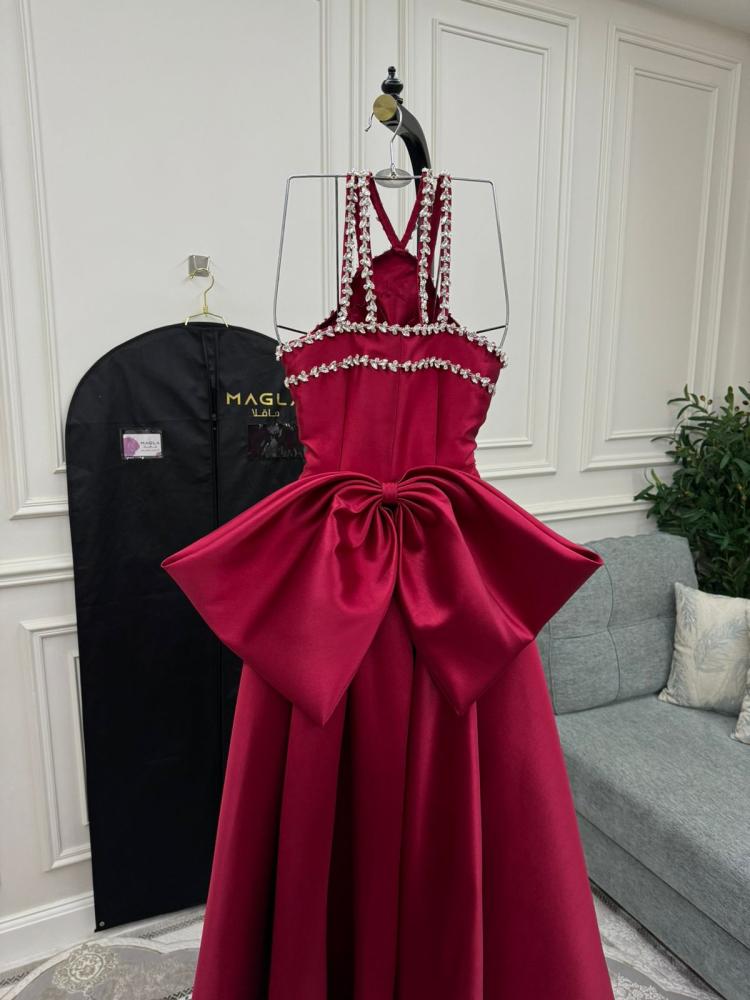 فستان المياسة الأحمر يأتي باللون الأحمر ومصنوع من قماش الميكادو، وهو نوع من القماش الفاخر والسميك الذي يعطي شكلًا وهيكلًا مميزًا للفستان. الفستان مطرز بفصوص ماسية في منطقة أعلى الصدر وبفيونكه اسفل الظهر، مما يضيف له لمسة من الفخامة والبريق. يأتي الفستان بأكمام علاقي مرصعة أيضًا بماسات جميلة، ويبلغ طول الفستان 160 سم، مما يجعله مناسبًا للمناسبات الرسمية والسهرات.