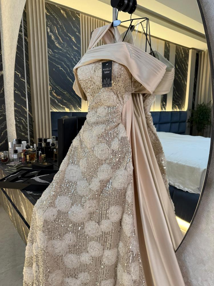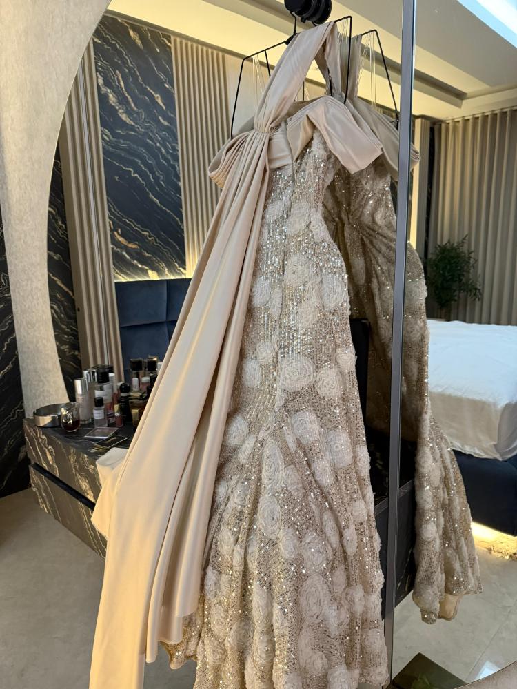 يأتي بلون بيج على ذهبي يفيض أنوثة وفخامة، بطول أمامي ١٥٧ سم وخلفي ١٦٩ سم يمنحك حضورًا ملكيًا.