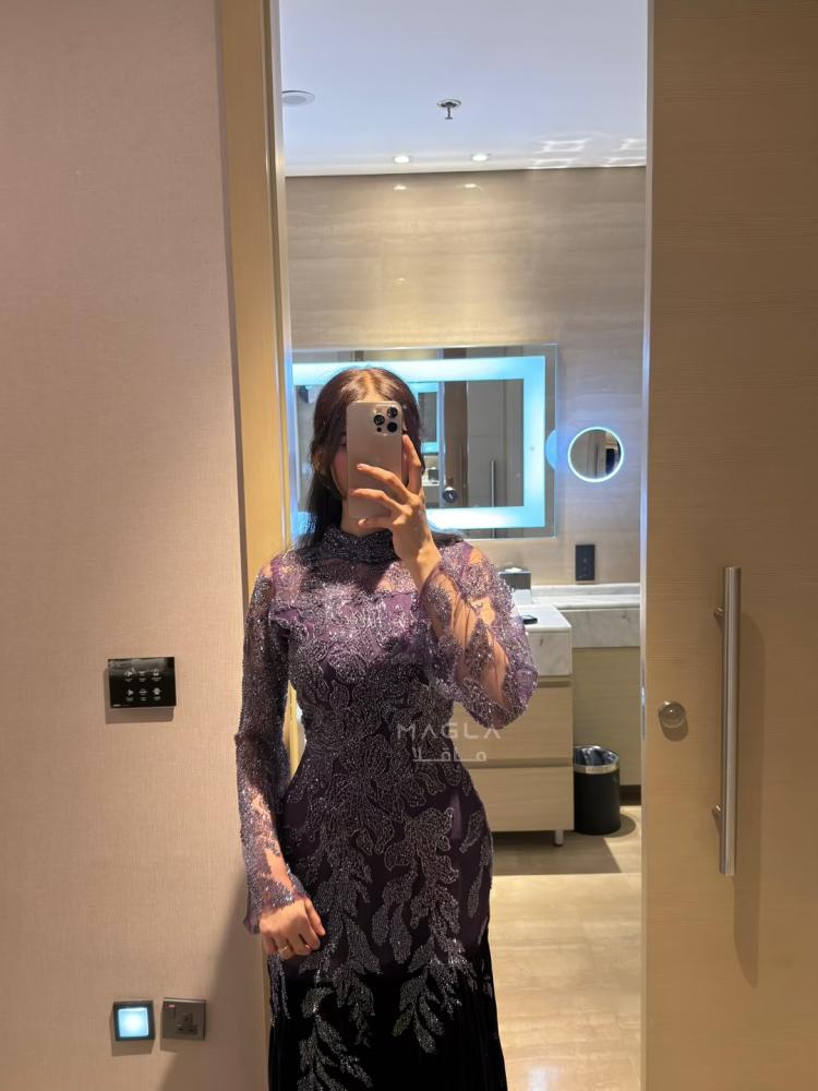 اللون موف ليلكي يعكس أنوثة هادئة ولمعان راقٍ، بطول ١٦٠ سم.