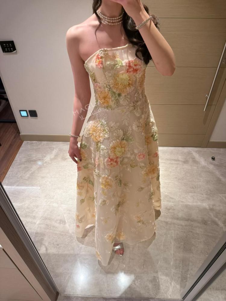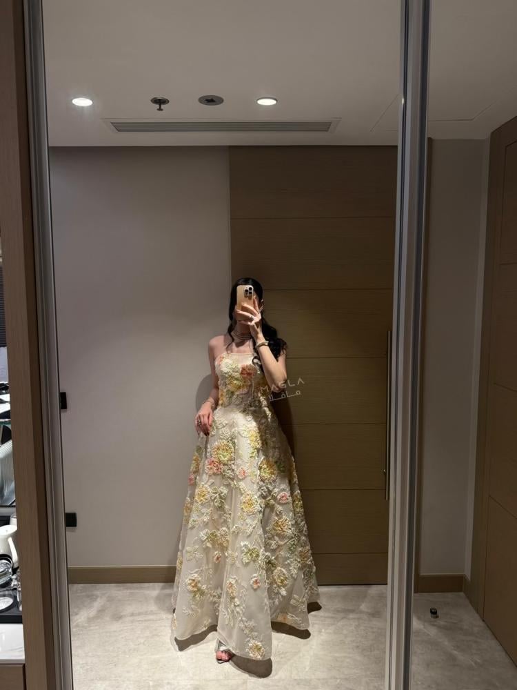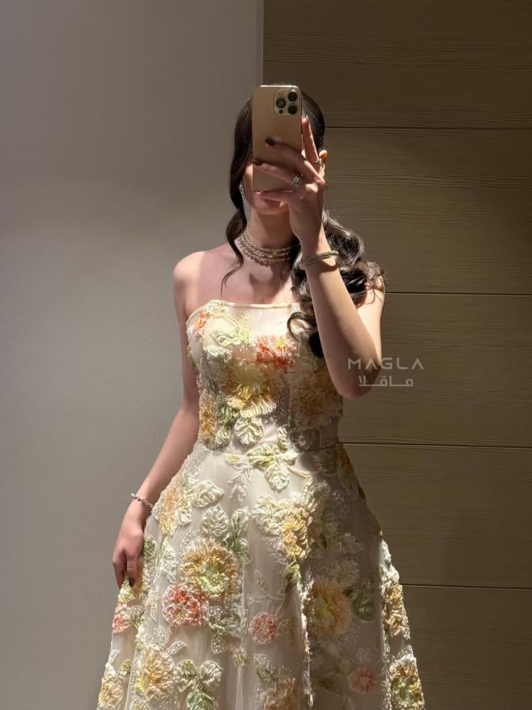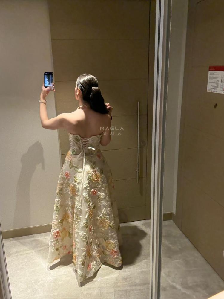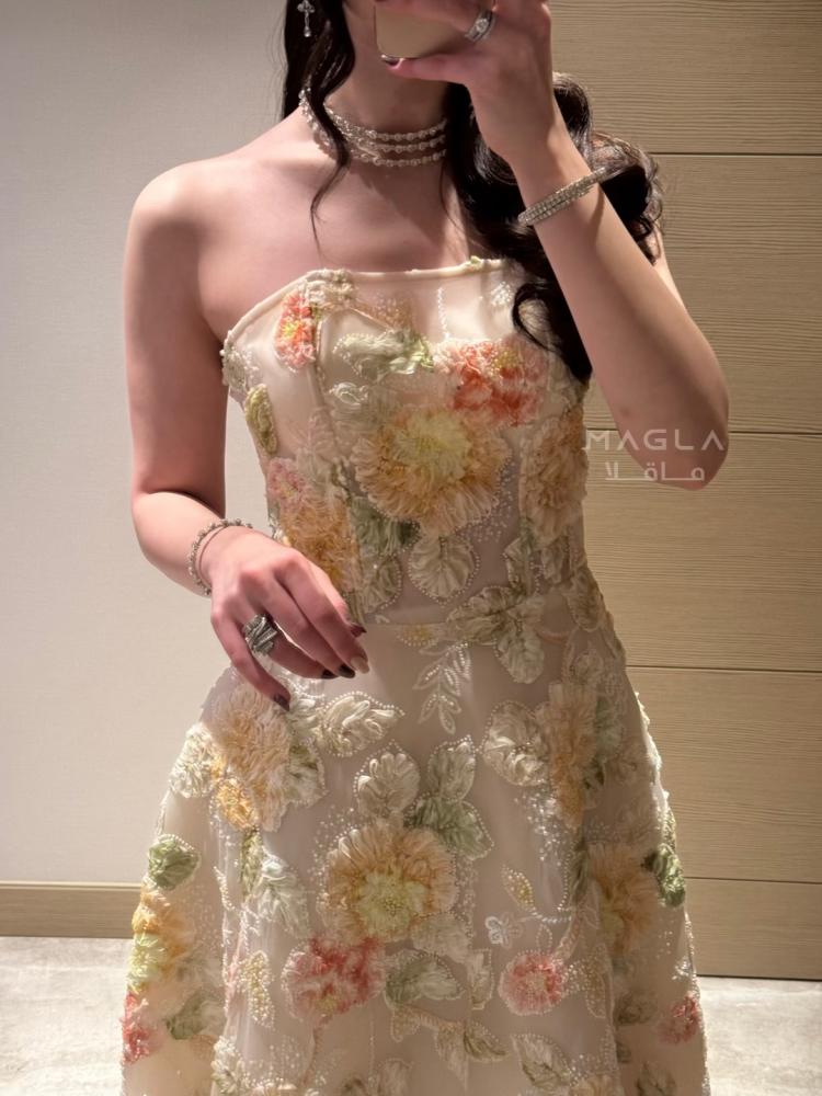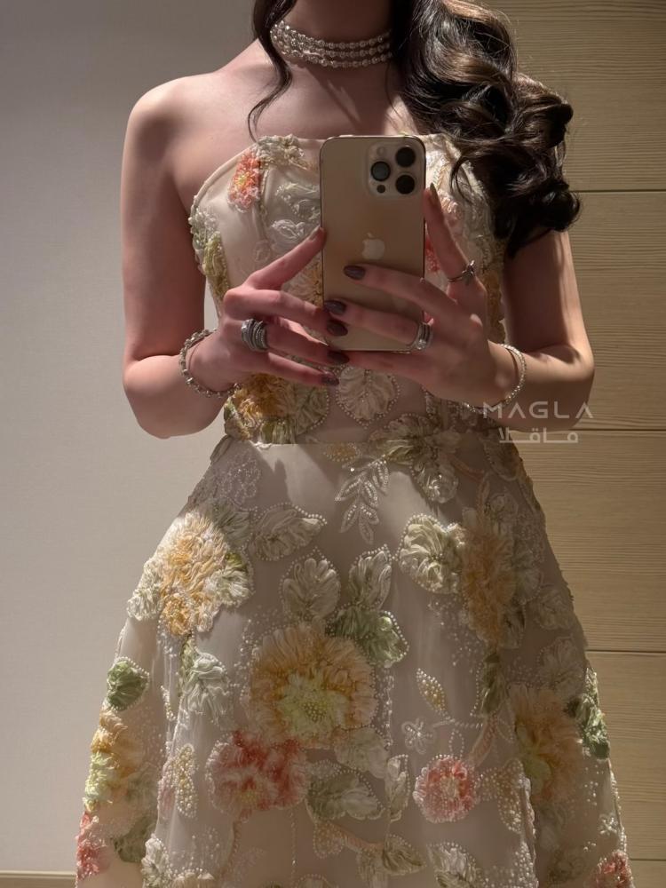 فستان ساحر من تل ناعم مطرز بتفاصيل ورود شيفون تتناثر عليها لمسات خرز وترتر شك يدوي تمنحه بريقاً أنثوياً متألقاً.