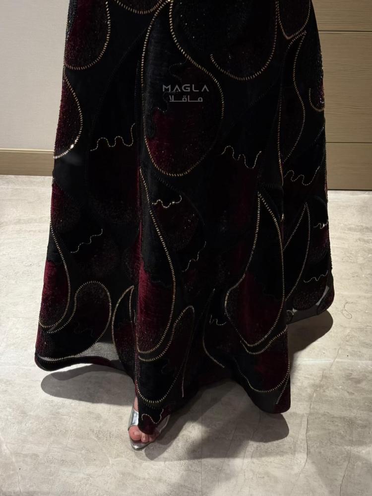 فستان سهرة راقٍ من قطيفة مخمل فاخر بتصميم قطرات الندى، يزدان بـ تطريز خرز شك يدوي يمنحه بريقًا متألقًا وتفاصيل فنية آسرة.