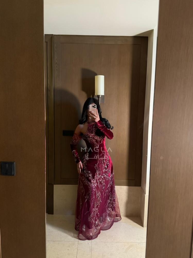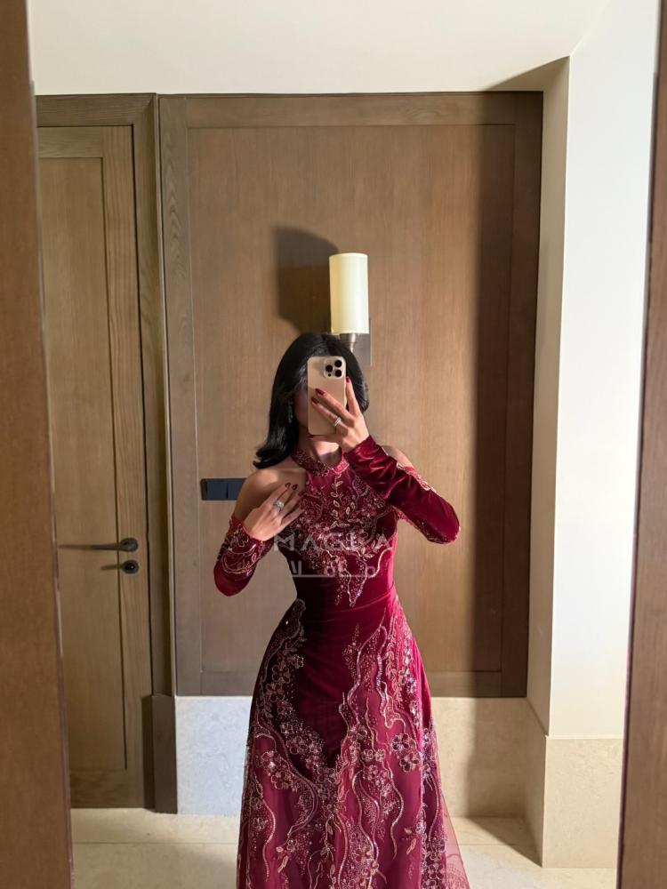إطلالة فاخرة من المخمل الراقي بتطريز خرز شك متقن مع بطانة باربي أنيقة، باللون البرقندي الملكي.