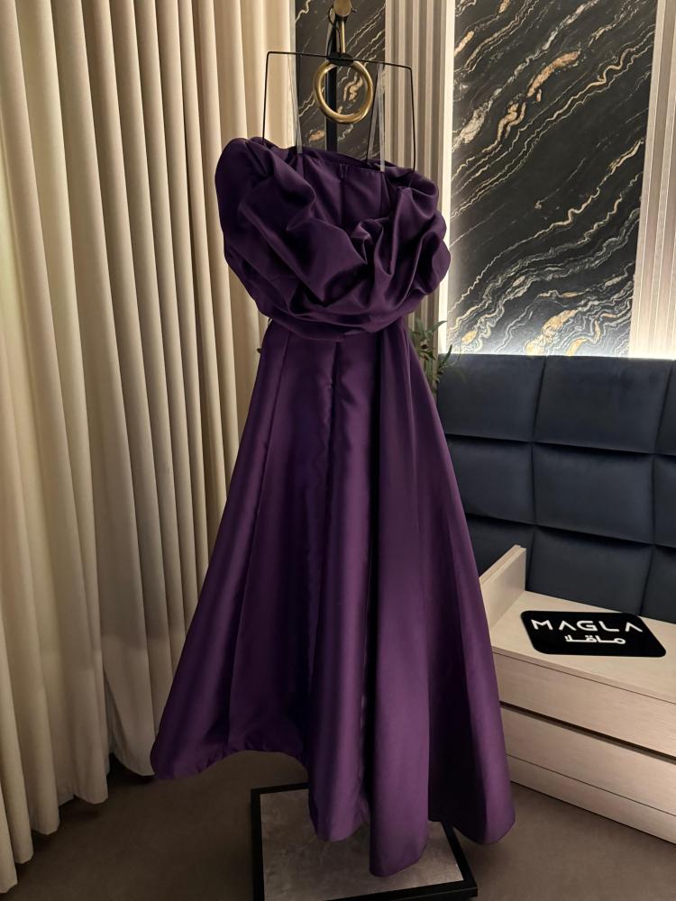فستان ليلكي ناعم مصنوع من قماش الميكادو الفاخر، بتصميم أنيق يبرز جمال الخامة ولمعتها، وسعره ٣٨٥ ريال.