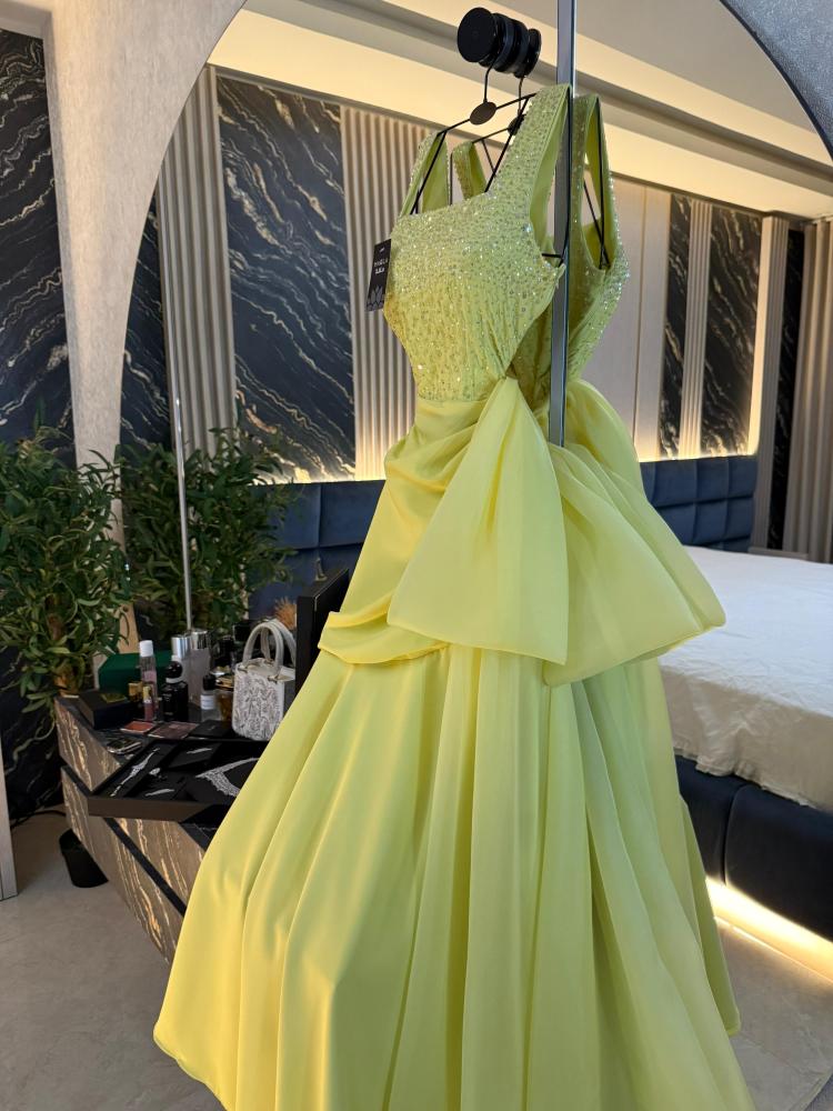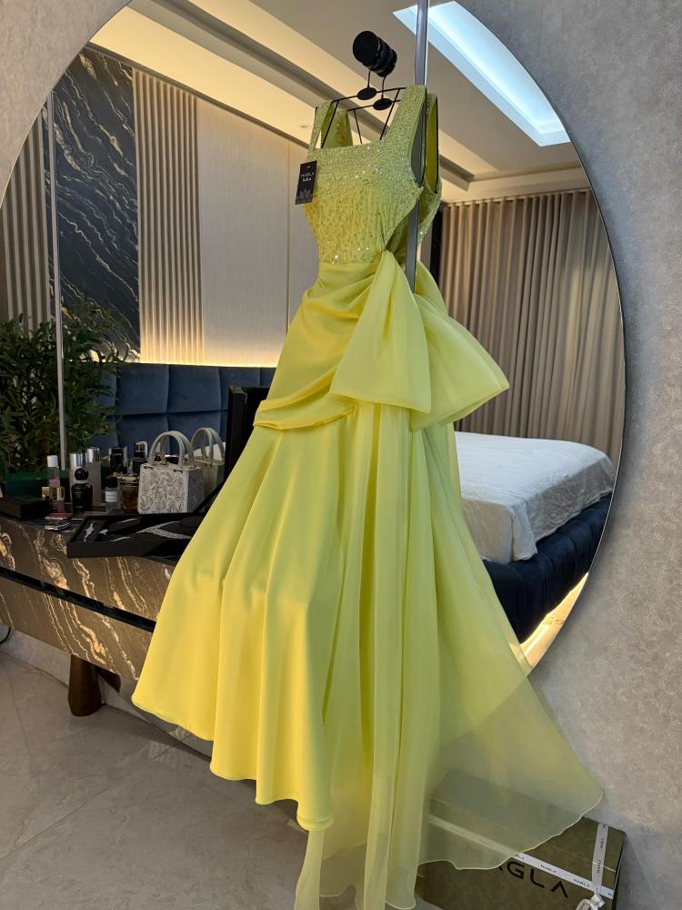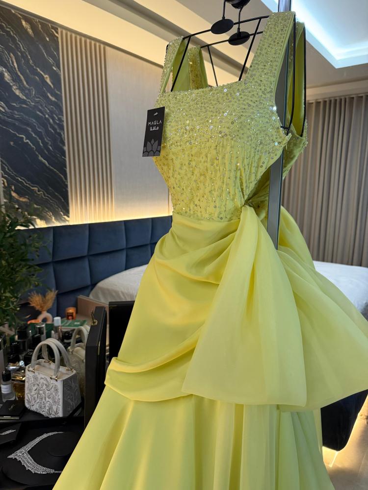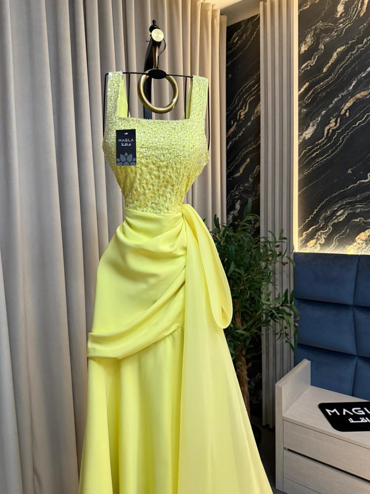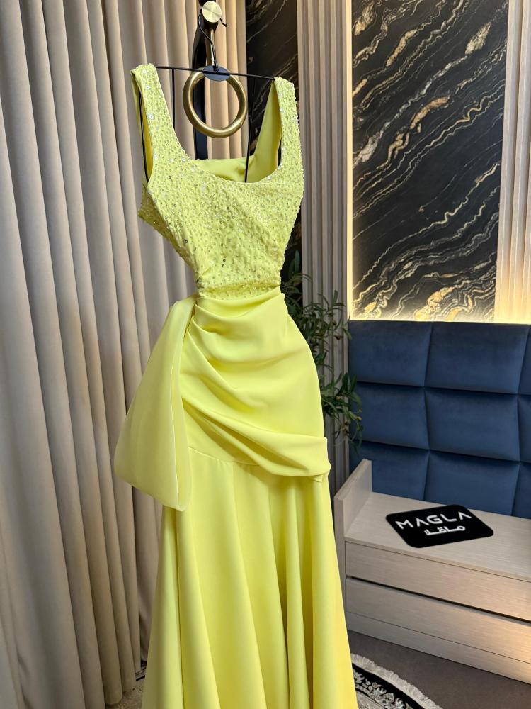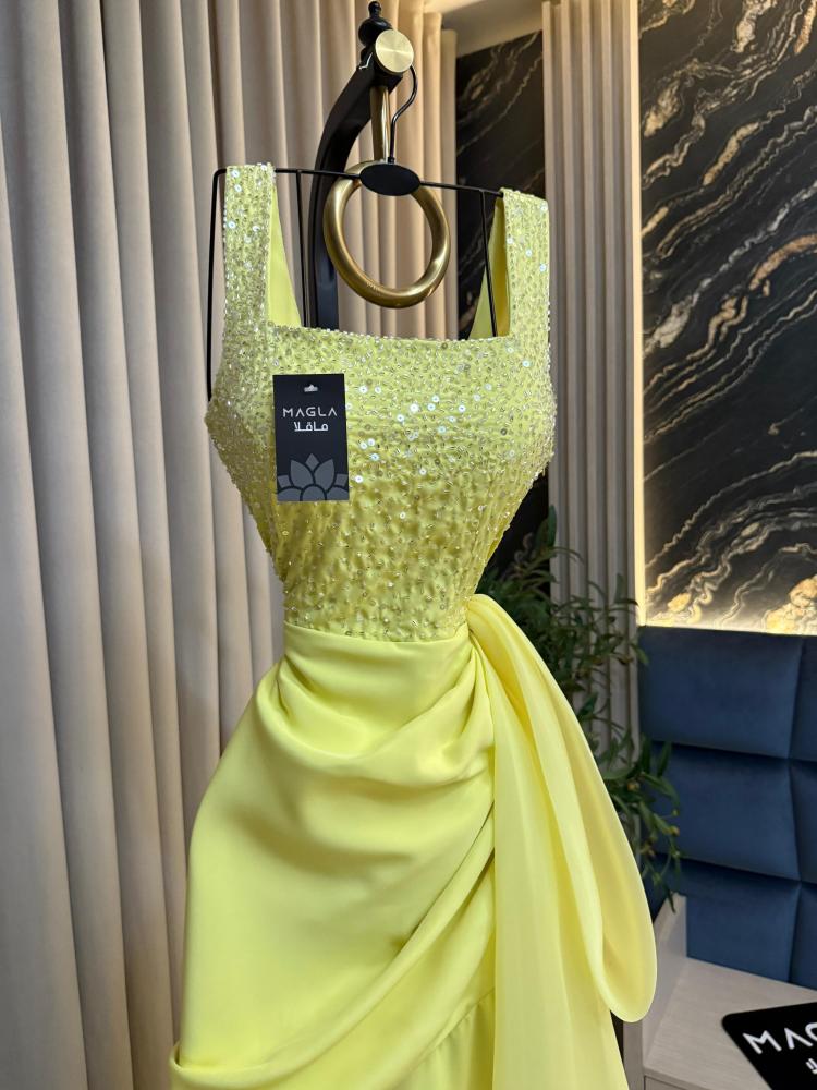 فستان أنيق بلون ليموني الناعم، مصمم من قماش الباربي الفاخر، ومزين بتطريز شك فخم على الصدر ليمنحك حضوراً مميزاً.