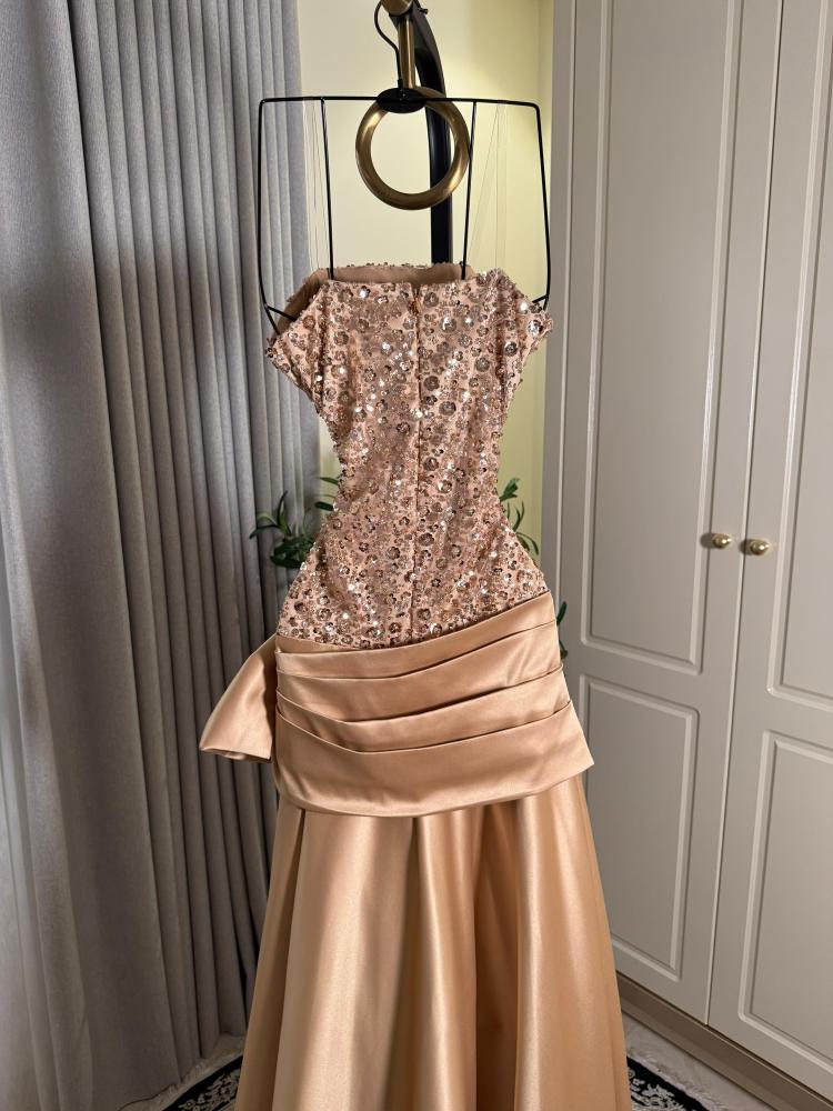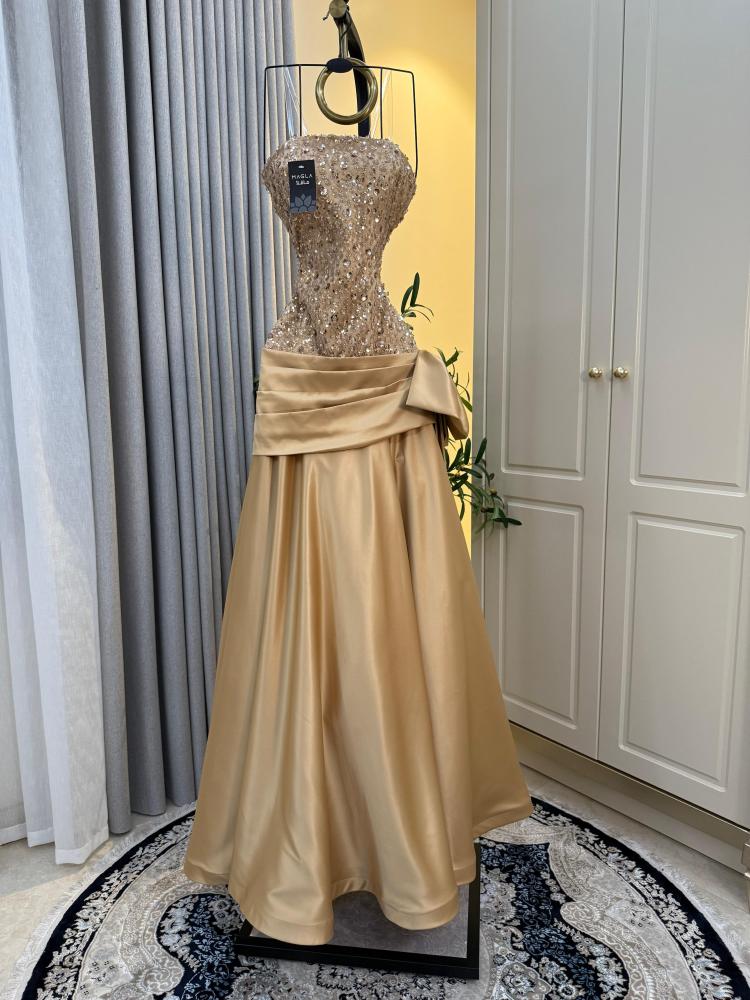 تألقي كأميرة في هذا الفستان الذهبي الساحر، المصنوع من أرقى أنواع التفته الحريرية، التي تنساب بنعومة فاخرة على القوام. يتميز بتطريز يدوي فاخر من الخرز اللامع والترتر الذهبي الذي يعكس الضوء كنجوم متناثرة على قماش ملكي. بطول 160 سم، يمنحك حضورًا راقيًا وإطلالة مترفة لا تُنسى. بسعر 425 ريال فقط، اجعلي كل الأنظار تلاحقك بإطلالة تُحاكي الفخامة الخالدة