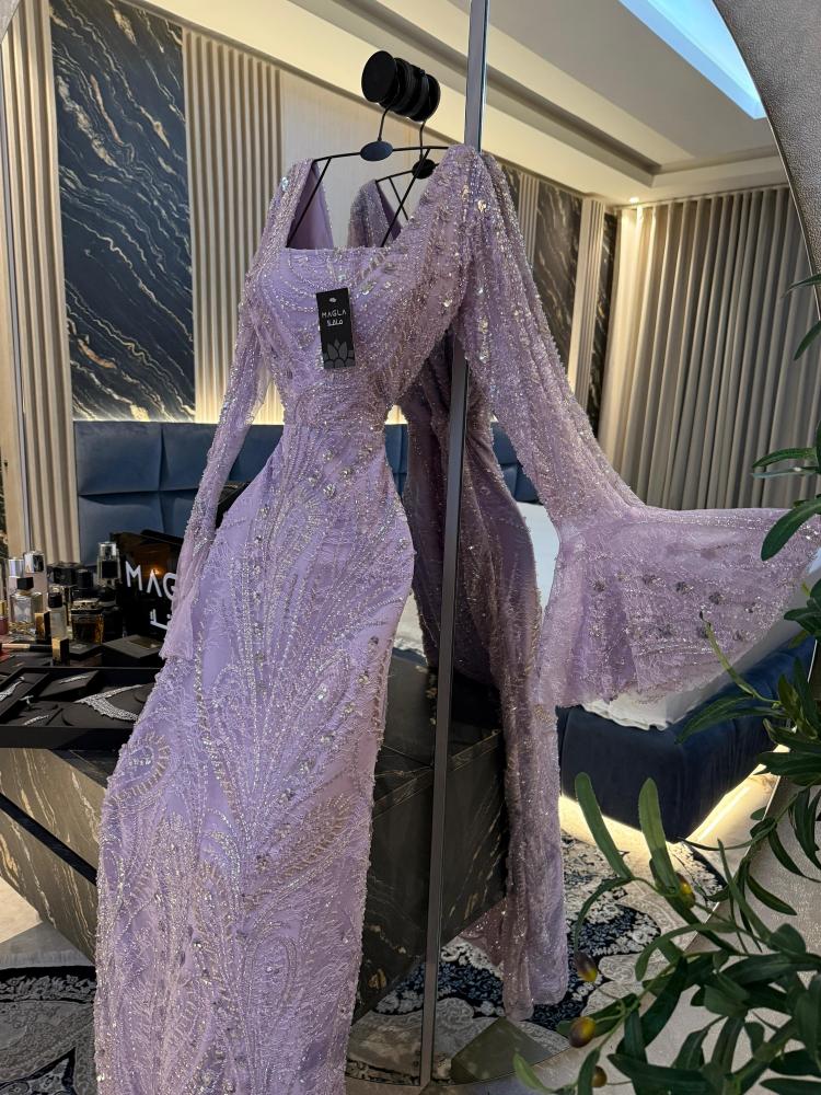 فستان رايزا بلس بحضور ملكي بلون موف لافندر الهادئ، من دانتيل فاخر مطرز يدوياً بـ خرز شك راقٍ يضفي بريقاً ناعماً وفخامة أنثوية على التصميم.