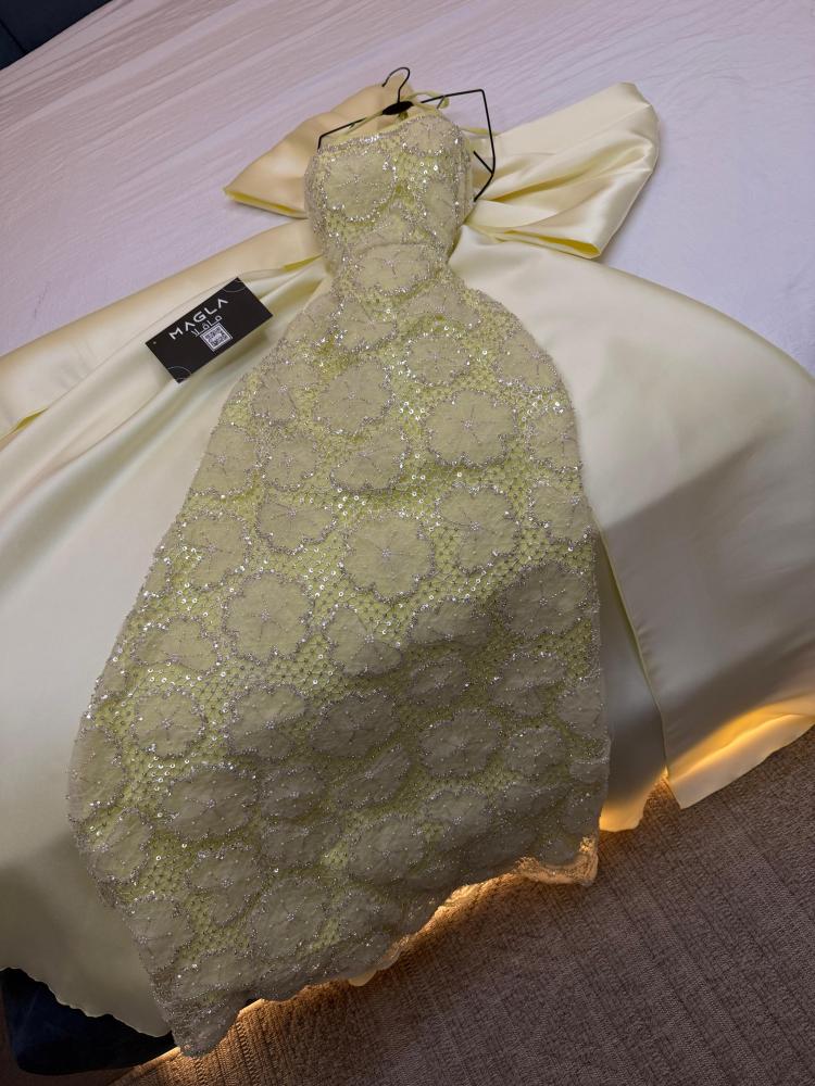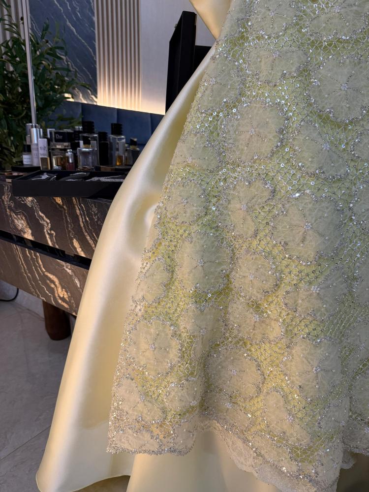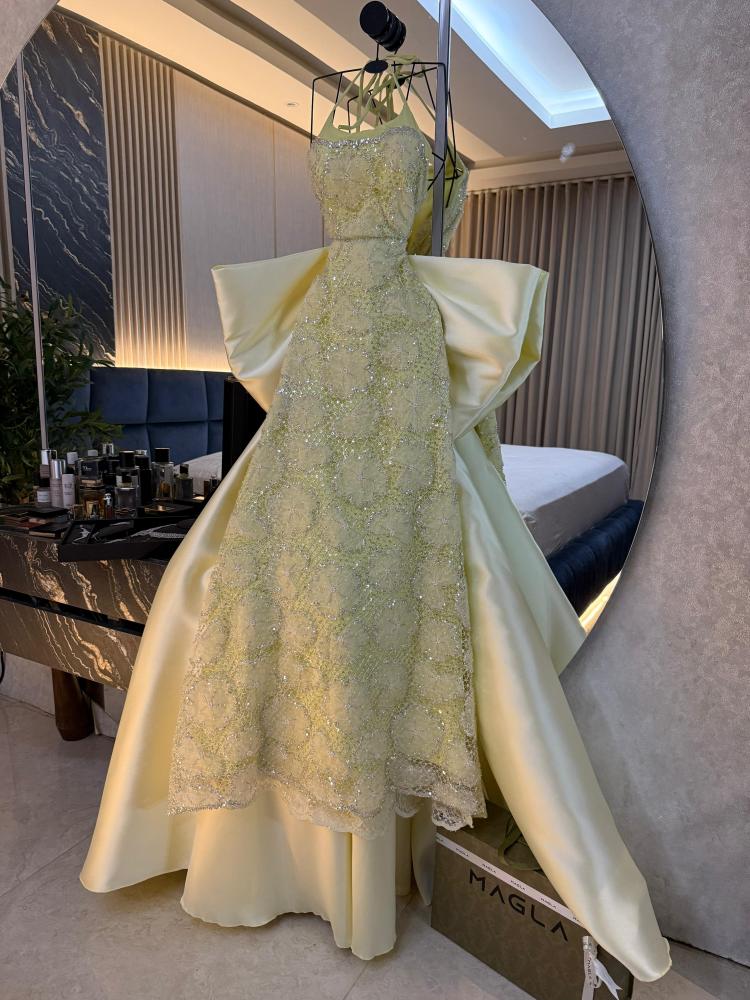 أناقة لا تُضاهى بتصميم يأسر الأنظار. مصنوع من تل سهره فاخر بتطريز خرز راقٍ ينبض بالفخامة، ويتميز بفيونكة أنثوية على الأكمام تضيف لمسة ساحرة. الذيل الطويل يزيد الإطلالة رُقياً وفخامة.
