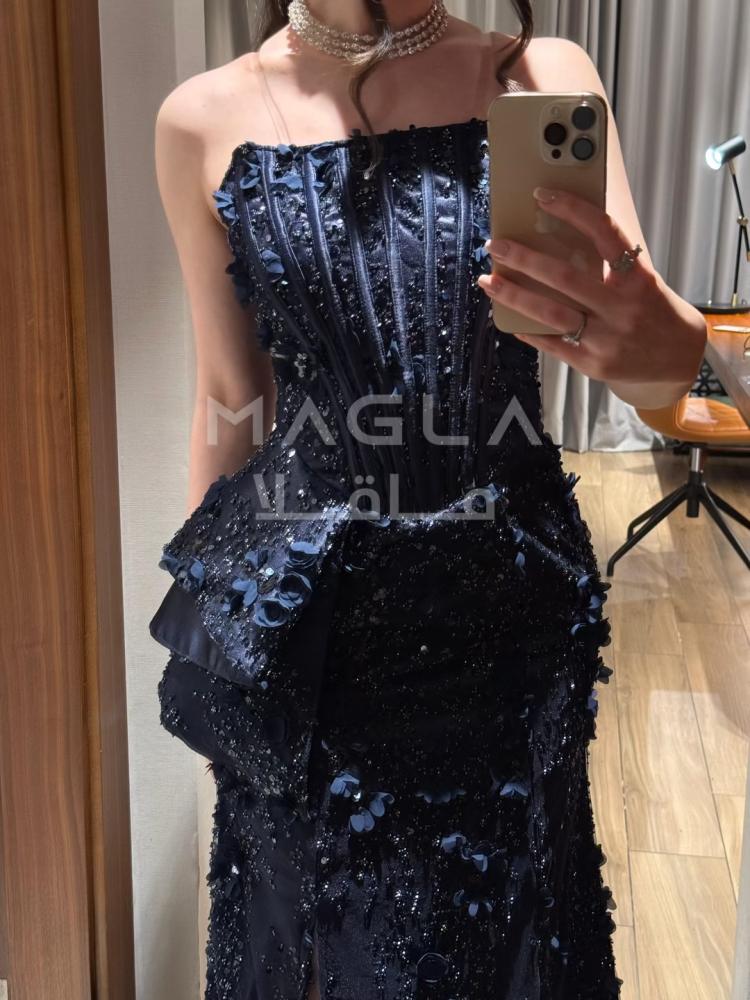 فستان سهره بتصميم يخطف الأنفاس، مصنوع من تل فاخر مطرّز بالكامل بالترتر اللامع مع ورود بارزة ثلاثية الأبعاد تمنح الإطلالة بعدًا أنثويًا راقيًا، فوق بطانة من التفته الأصلية لتعزيز الفخامة والثبات.