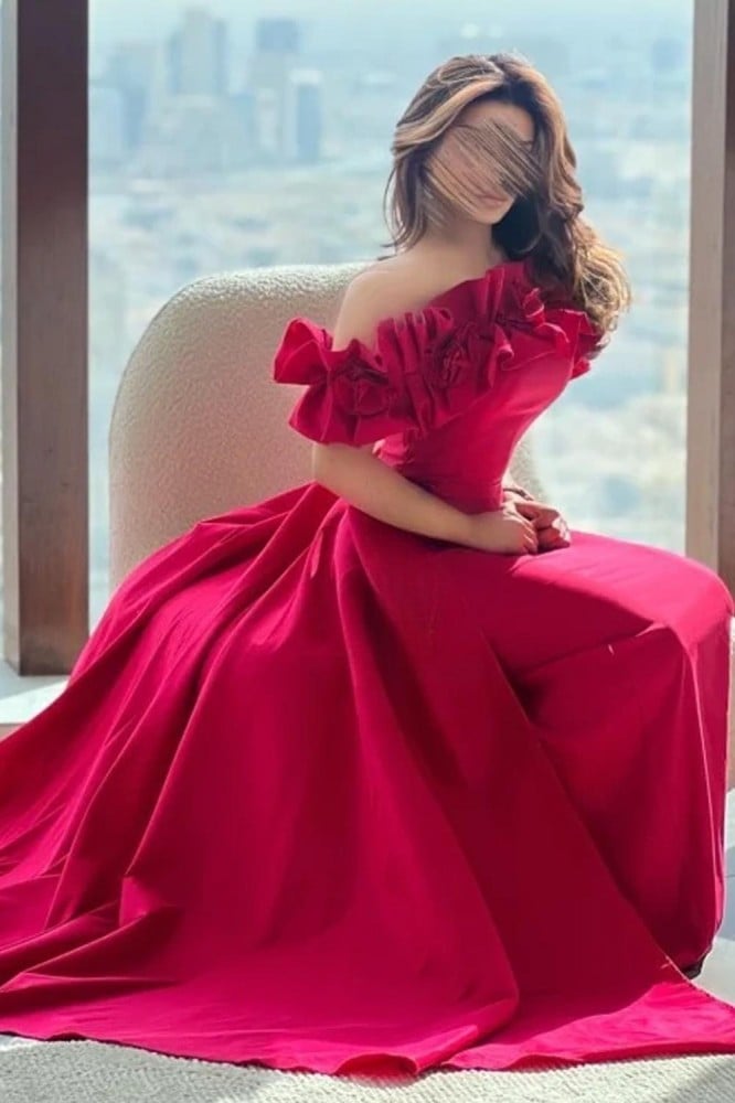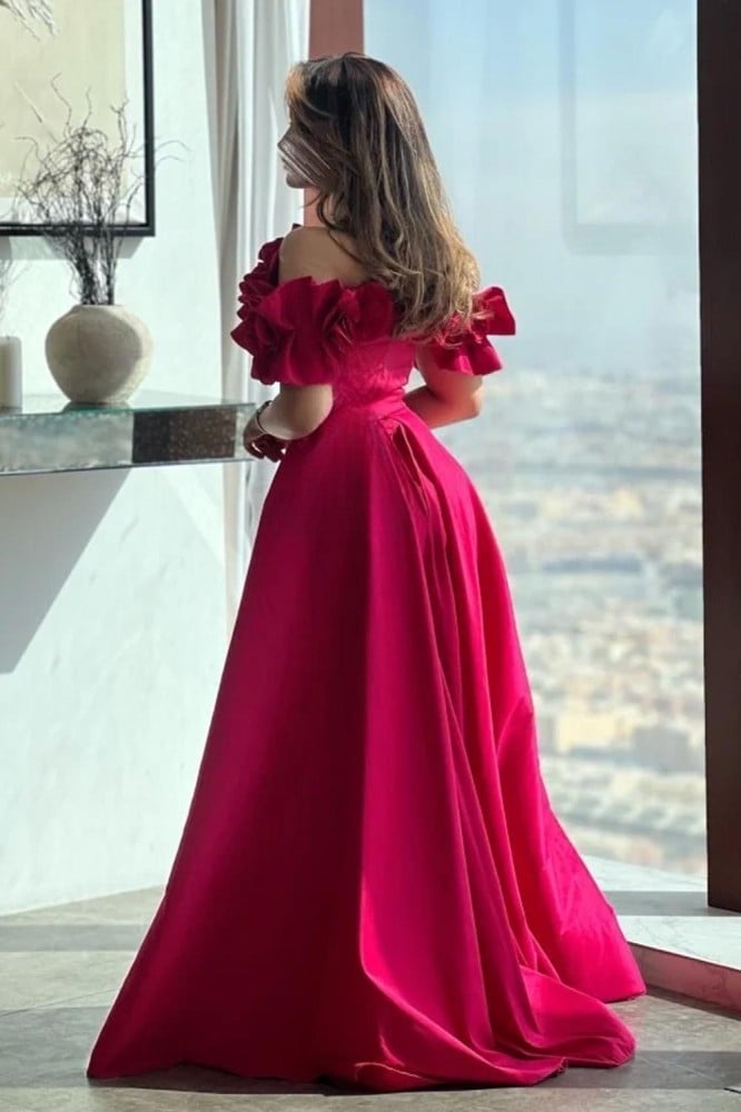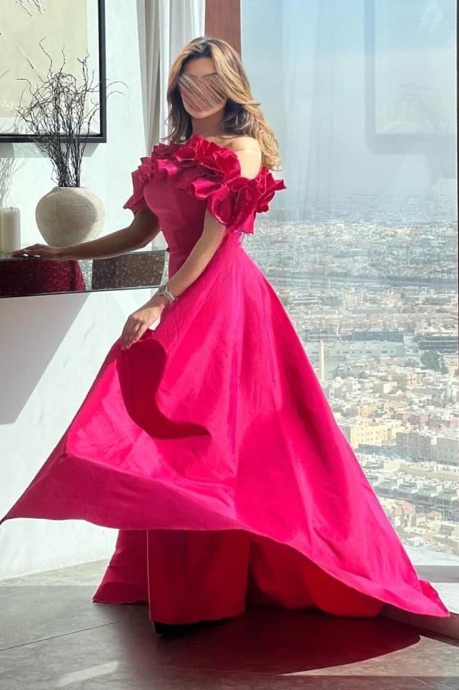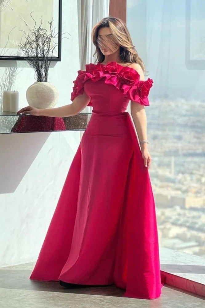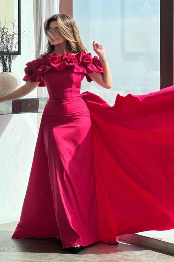 فستان سهرة بذيل طويل وورود على الصدر بعناية فائقة ليسلط الضوء على جمالك وأناقتك في كل مناسبة تحضرينها ، يأتي بقصة سمكة رائع يجعلك تبدين متألقة وفريدة من نوعك .