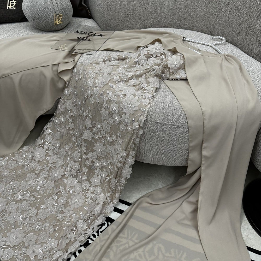 فستان سهرة شيفون مطرز ، يأتي برداء شيفون منفصل وهو قطعة أنيقة وجذابة تجمع بين التصميم العصري والأناقة الكلاسيكية ، يأتي هذا الفستان بقصة السمكة يبرز جمال قوام المرأة ويسلط الضوء على مفاتنها ، يمتاز كذلك بلونه البيج الرائع الذي يضفي عليه طابعًا عصريًا وأنيقًا .