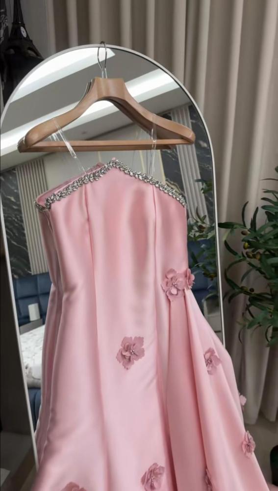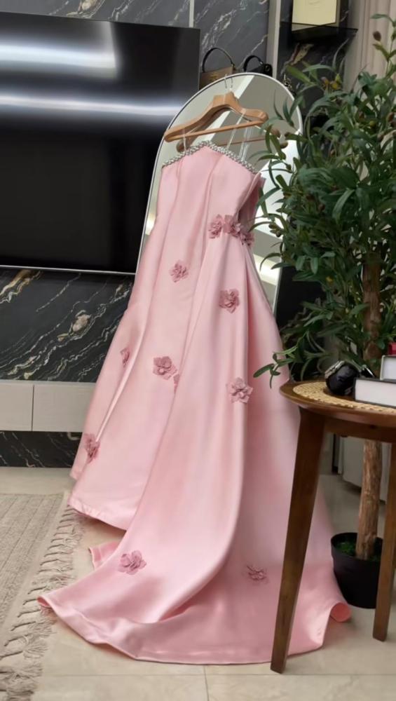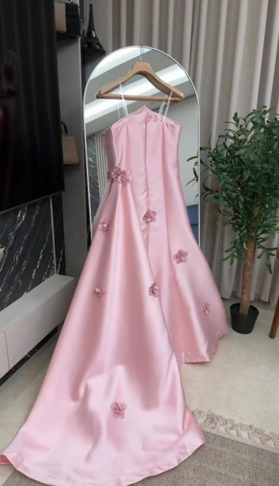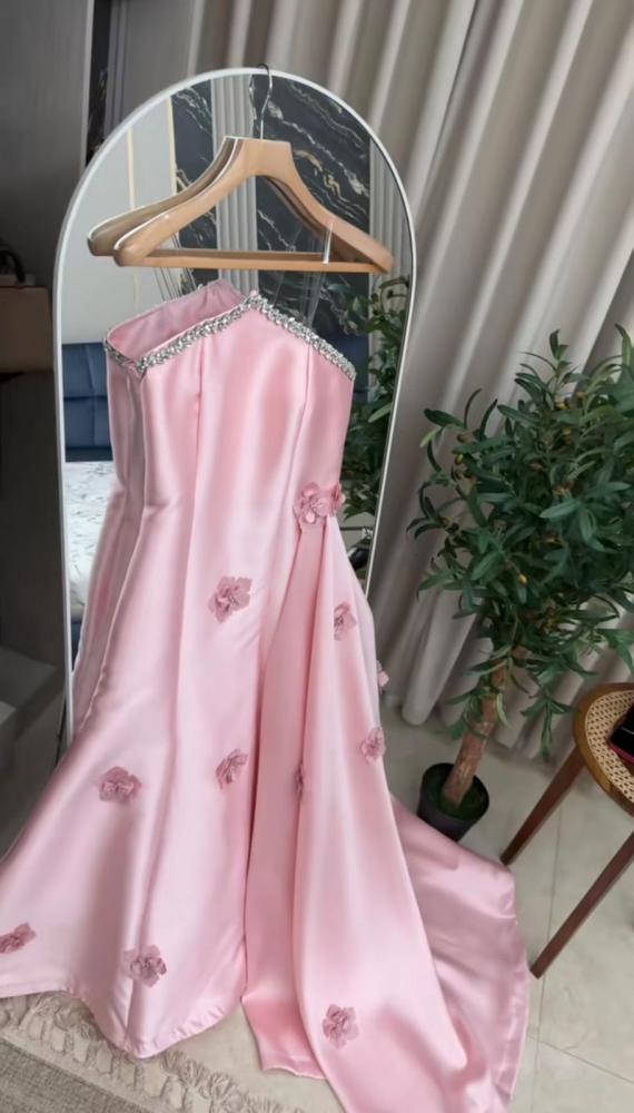أطلبي الآن فستان سهره بتصميم ورود وذيل في الجنب