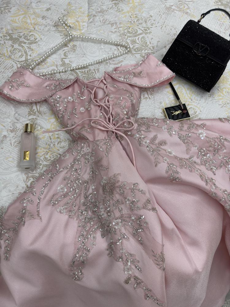 اطلبي الأن فستان سهره بيبي بينك دبل كلوش مطرز