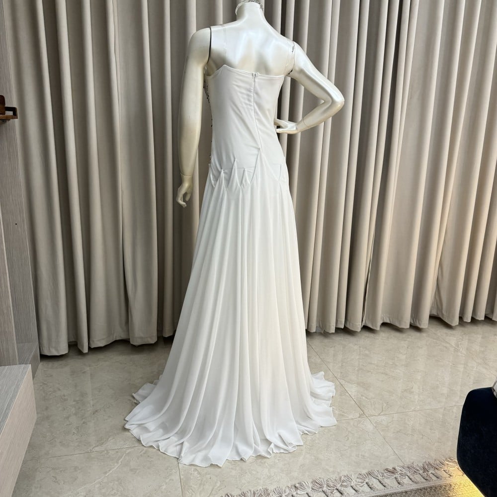 اشعري بالأناقة والجمال مع فستان السهرة تريبل كلوش طايح بصدر مطرز. يتميز هذا الفستان بتصميمه الفريد والمبهج، حيث يأتي بقصة كلوش ولون أبيض أنيق يضفي لمسة من الأناقة والجمال على إطلالتك.