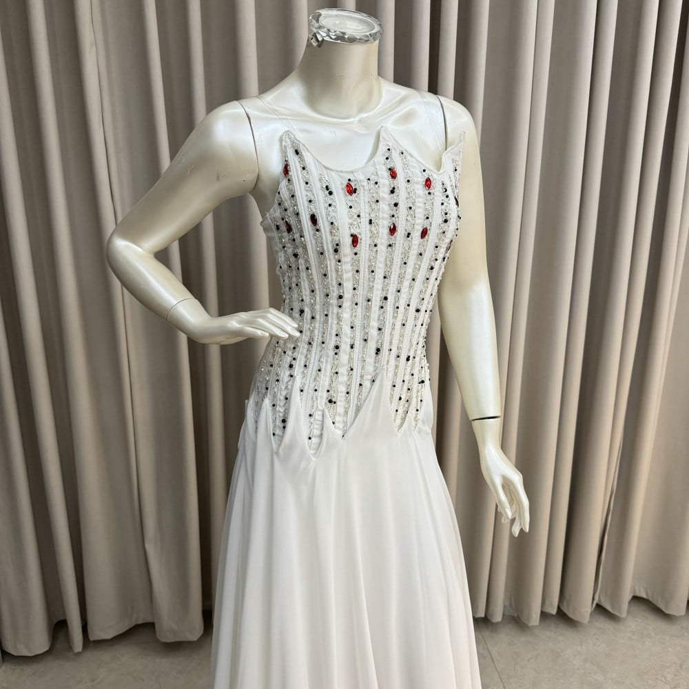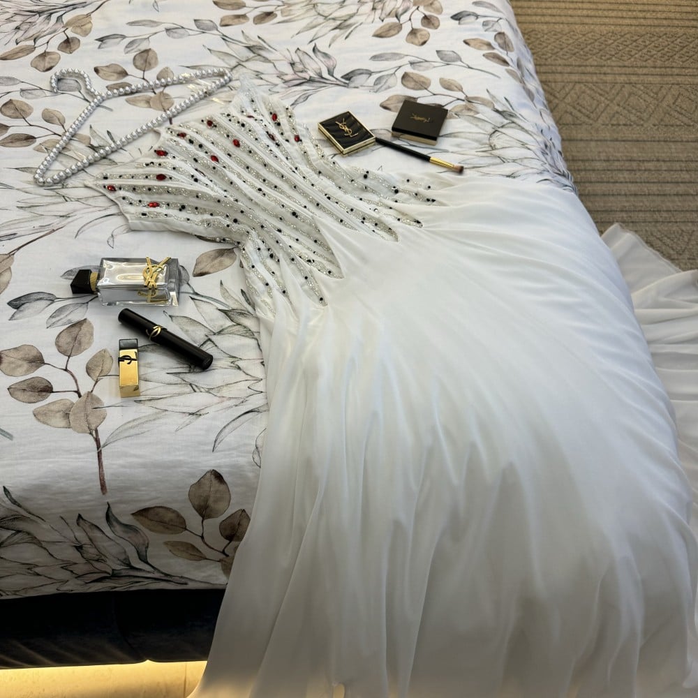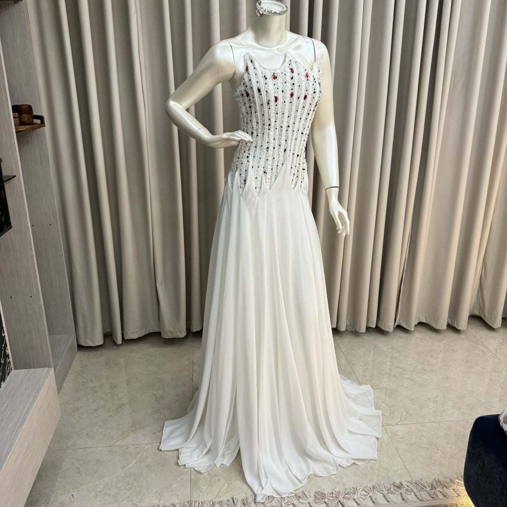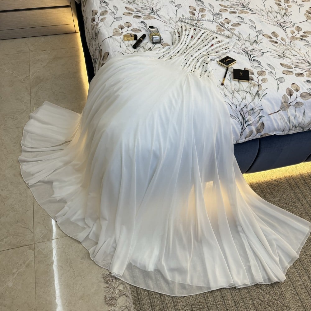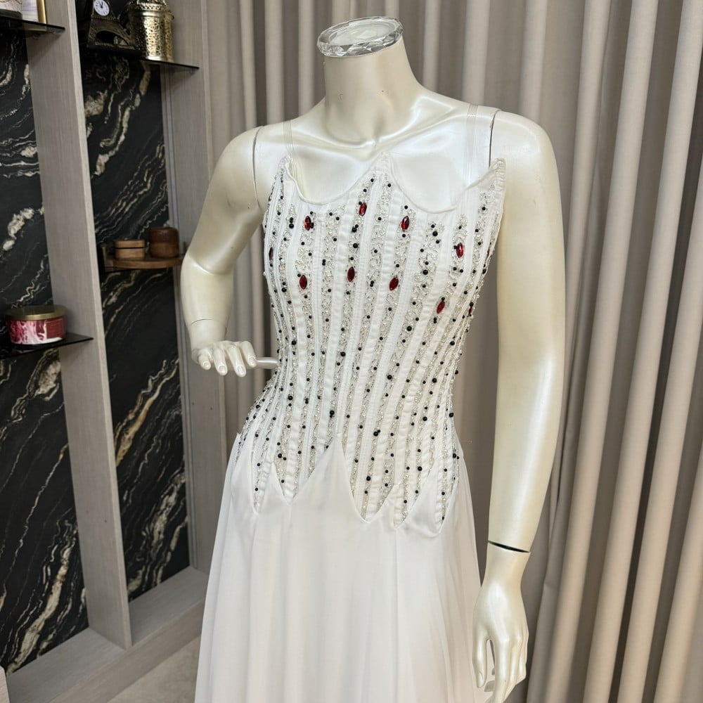 مصنوع من قماش الشيفون الكلوش عالي الجودة، يوفر هذا الفستان الانسيابية والراحة لتتمتعي بحرية الحركة طوال الليلة. يتميز الصدر المطرز بتفاصيل جميلة ومتقنة، مما يجعل هذا الفستان لافتًا ومميزًا.