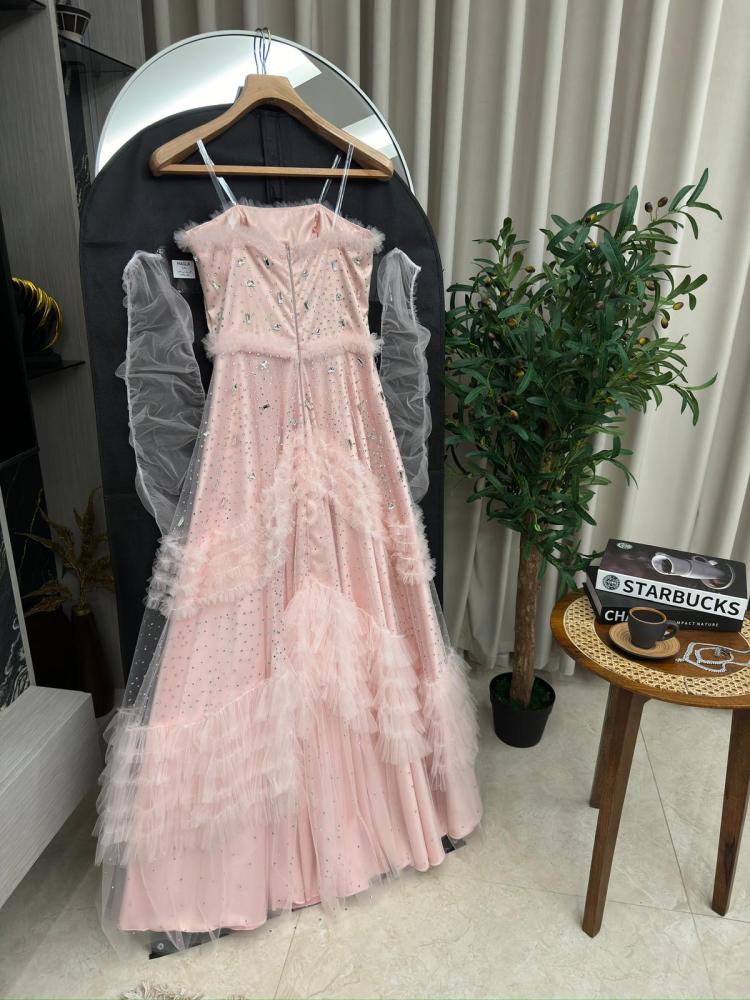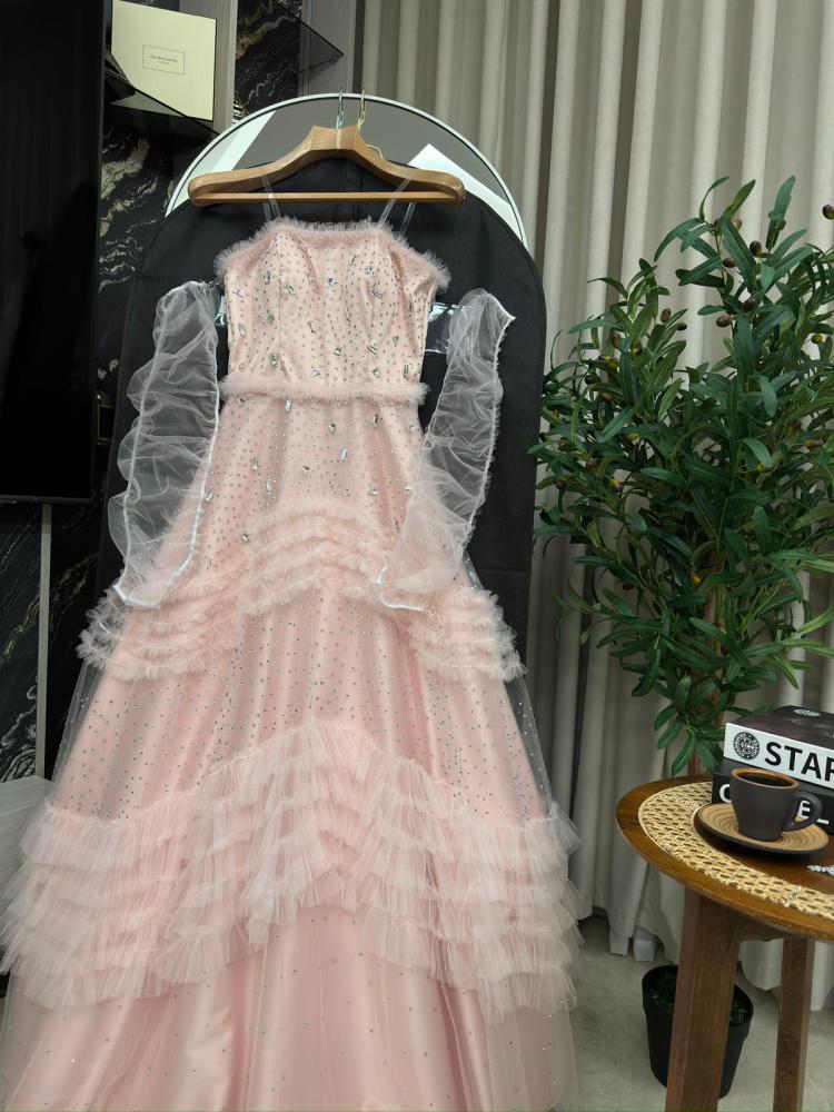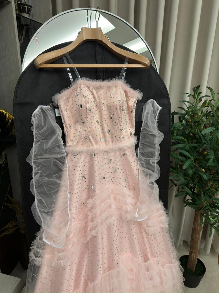 الفستان متوفر بلون بيبي بنك جميل، يضفي لمسة من الأناقة والسحر على إطلالتك. يأتي بتصميم تل وتطريز فصوص زيركون شك يدوي، مما يعطيه مظهرًا أنثويًا وجميلًا.