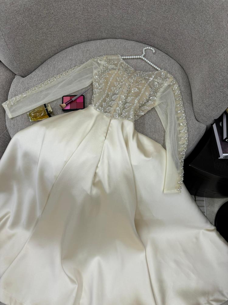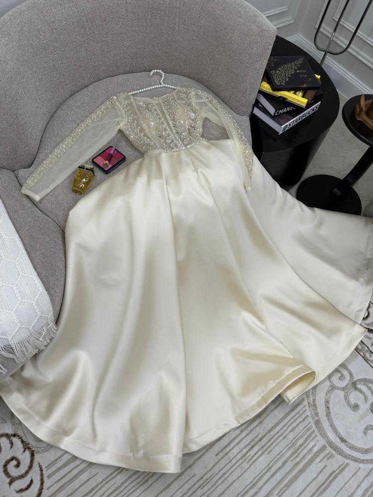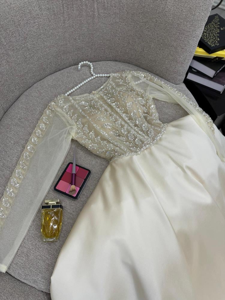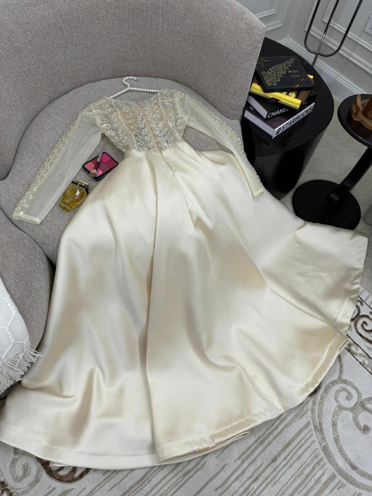 تصميم القصة الدبل كلوش يجعل الفستان يتدفق ويتحرك بجمالية عند الحركة، مما يخلق مظهرًا أنيقًا وراقيًا. يتميز هذا الفستان بقصة الصدر الدائرية التي تبرز جمالك وتضفي لمسة أنوثة رقيقة. الأكمام الطويلة المطرزه تضيف لمسة أناقة وجمال على الفستان.