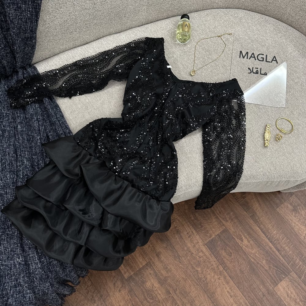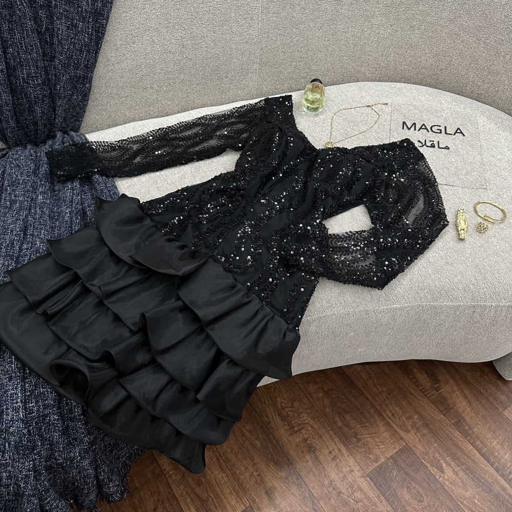 - فستان سهره قصير يسمح لك بأن تُضيفي لمسة من الأناقة والجاذبية إلى إطلالتك في المناسبات الخاصة ، ومع تصميمه الفريد بقصة كلوش طبقات من الأسفل يضفي لمسة أنثوية ساحرة