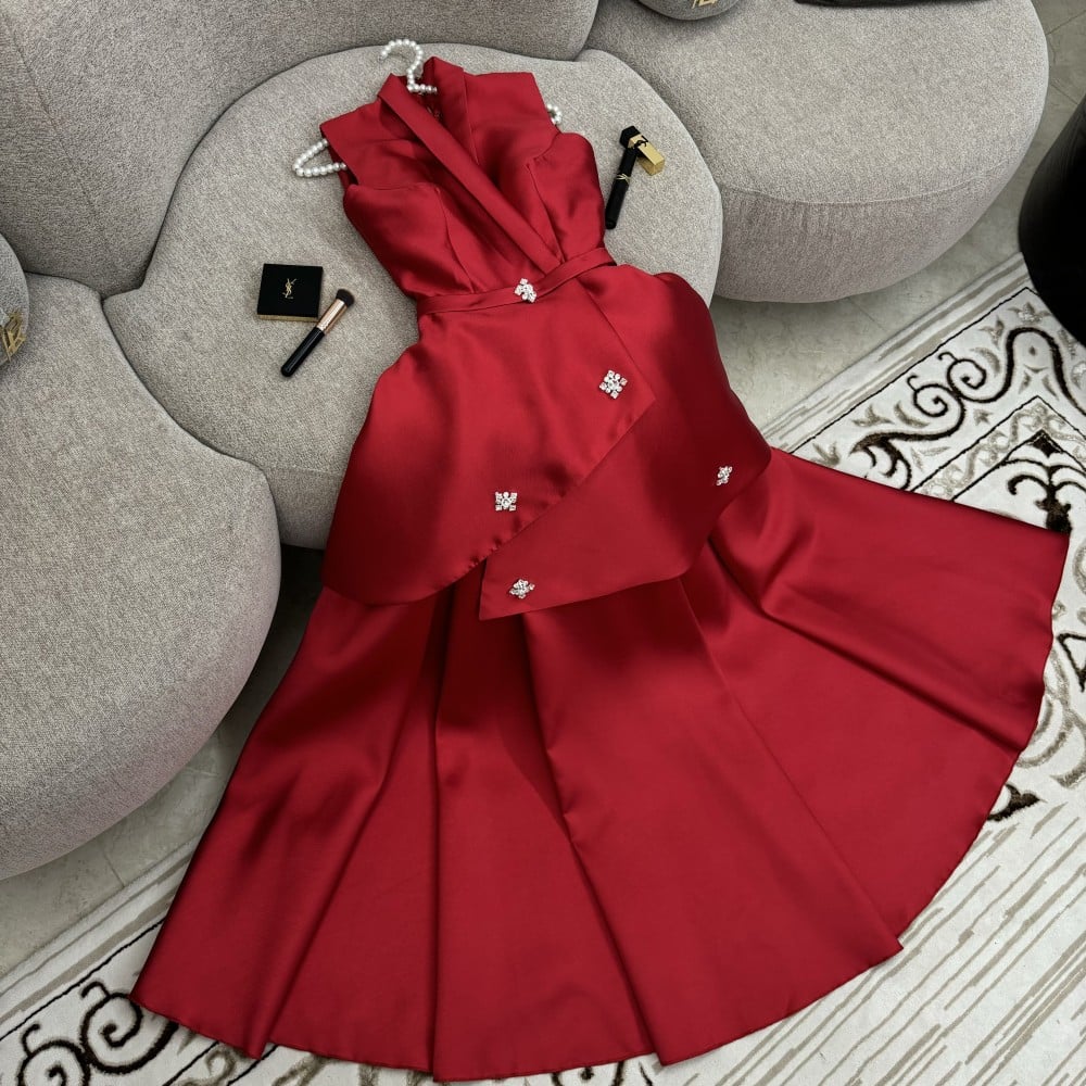 احصلي على إطلالة ساحرة ومميزة مع هذا فستان سهره كلوش بتطريز زيراكون الأنيق. يتميز الفستان بتصميم كلوش الذي يمنحك مظهرًا أنثويًا وجميلًا. مصنوع من قماش ميكادو عالي الجودة الذي يضفي لمسة أناقة وجمالية على الفستان. يأتي بلون أحمر جذاب ومتألق يلفت الأنظار في أي مناسبة مثل الزواج والمناسبات الخاصة وحفلات الخطوبة.