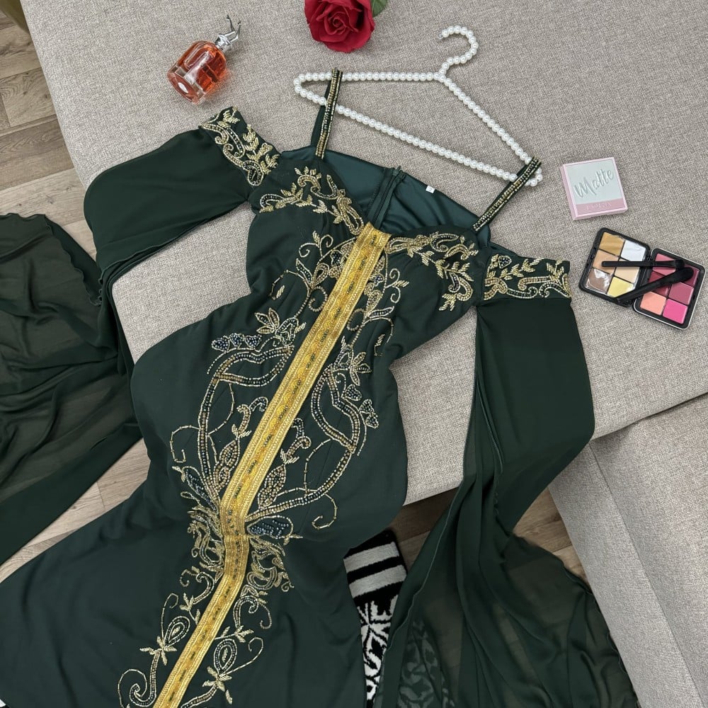 يأتي بلون زيتي جذاب ومميز يضفي لمسة من الأناقة والأنوثة على إطلالتك. يتوفر بمقاسات متعددة وطول يبلغ 160 سم. اطلبي الآن فستان سهرة مطرز كامل بأكمام شيفون طويلة وكوني محط الأنظار في أي مناسبة تحضرينها. ستتألقين بإطلالة أنيقة ومميزة تجعلك محط أنظار الجميع.