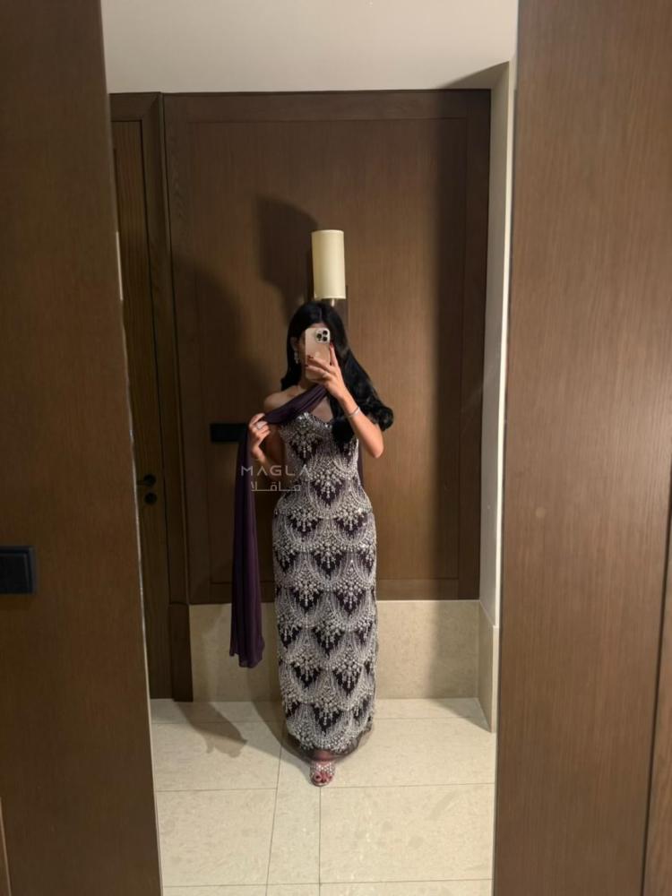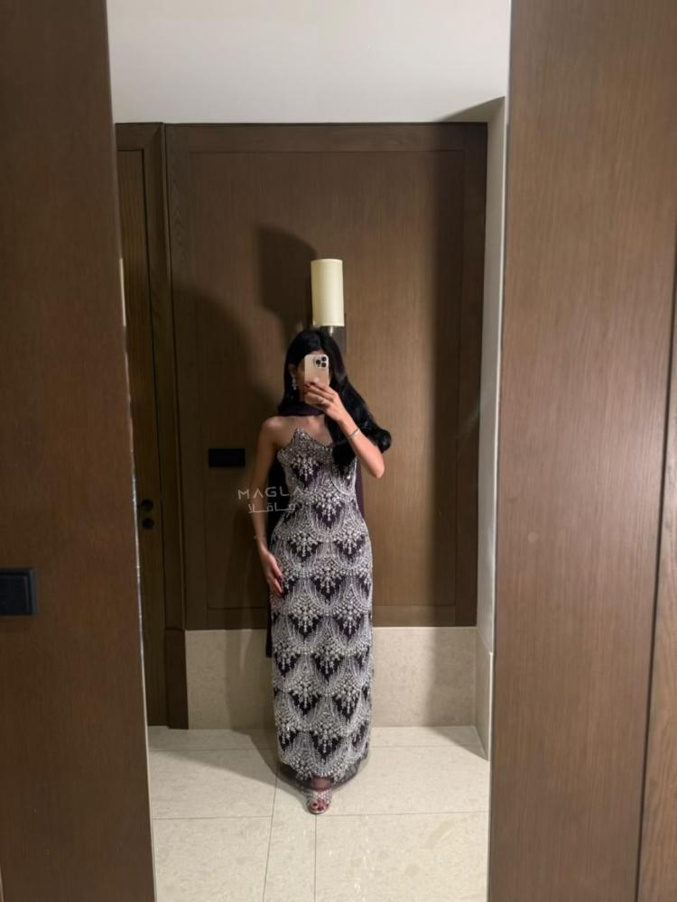 إطلالة أنثوية فاخرة بتصميم سكيني يبرز جمال القوام، مصنوع من تل سهره مطرز خرز شك يدوي بتفاصيل دقيقة تضيف لمسة فخامة استثنائية.