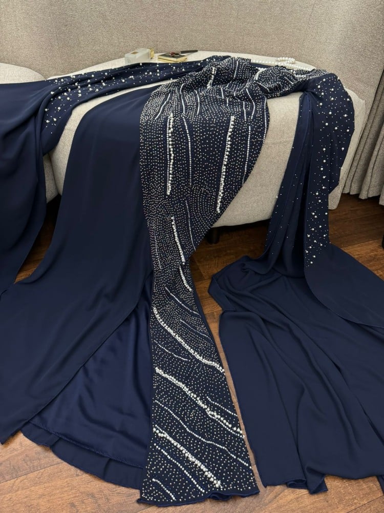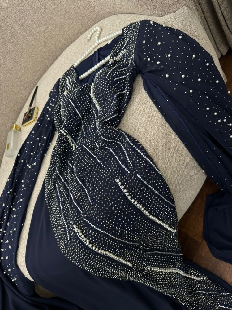 احصلي الأن على فستان شيفون كحلي مطرز كامل