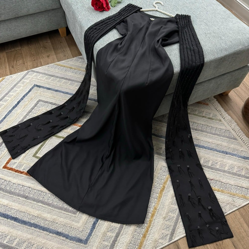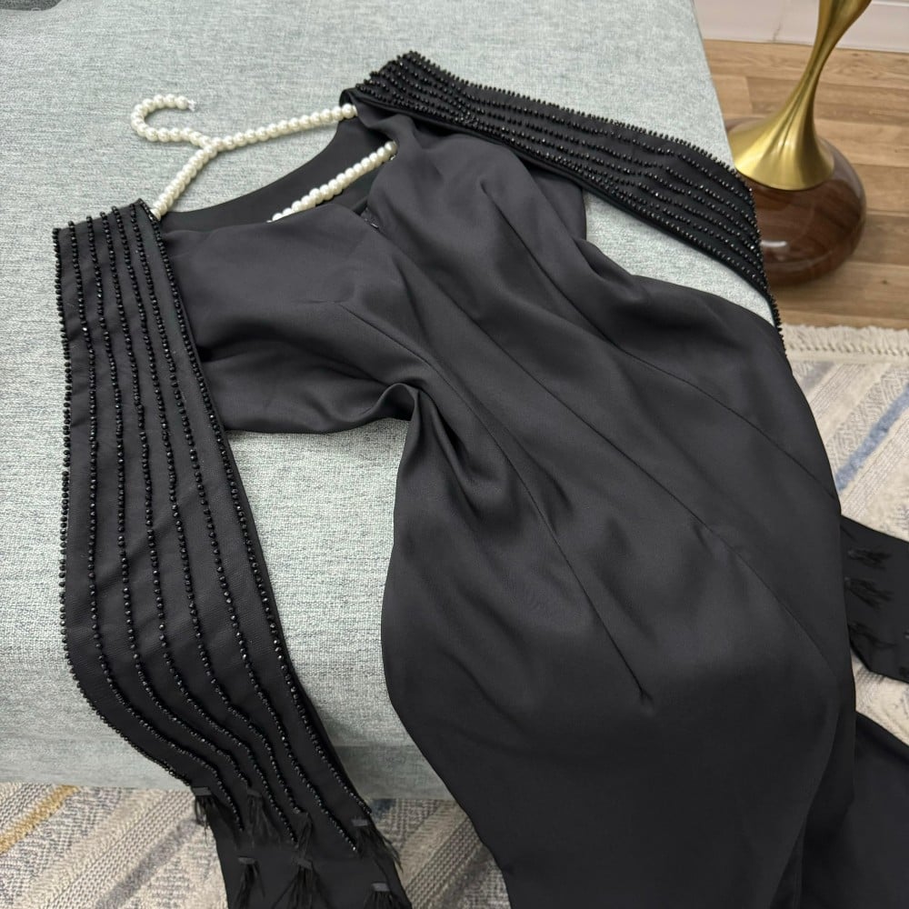 فستان طويل فخم لون أسود ناعم ويعتبر قطعة أساسية في خزانة أي سيدة ، يتميز هذا تصميم الفستان الأسود بقصته الناعمة والمريحة ، مما يتيح للمرأة الحرية في التحرك والرقص طوال مدة المناسبة ، مصنوع من قماش حرير ناعم مما يضفي مظهرًا جميلاً وأنيقًا على أي امرأة ، وهو متوفر بعدة مقاسات ومناسب لحضور أي حفلة أو مناسبة خاصة .