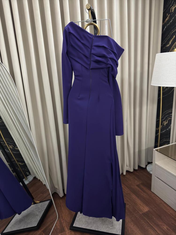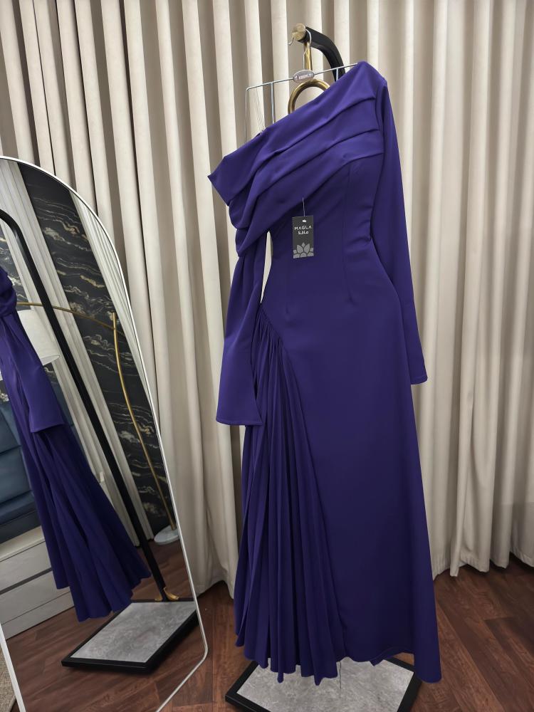 يأتي بلون موف ليضيف لمسة جمالية وأنيقة للفستان. القماش المستخدم هو باربي الذي يمنح الفستان ملمسًا ناعمًا ،