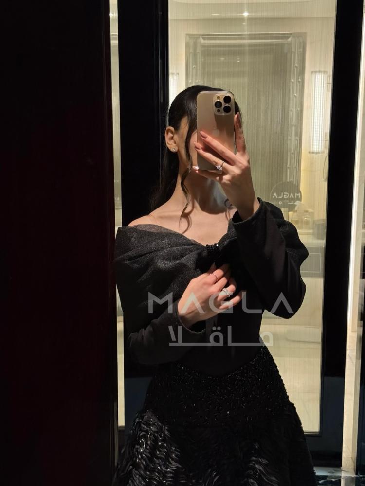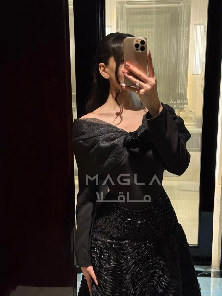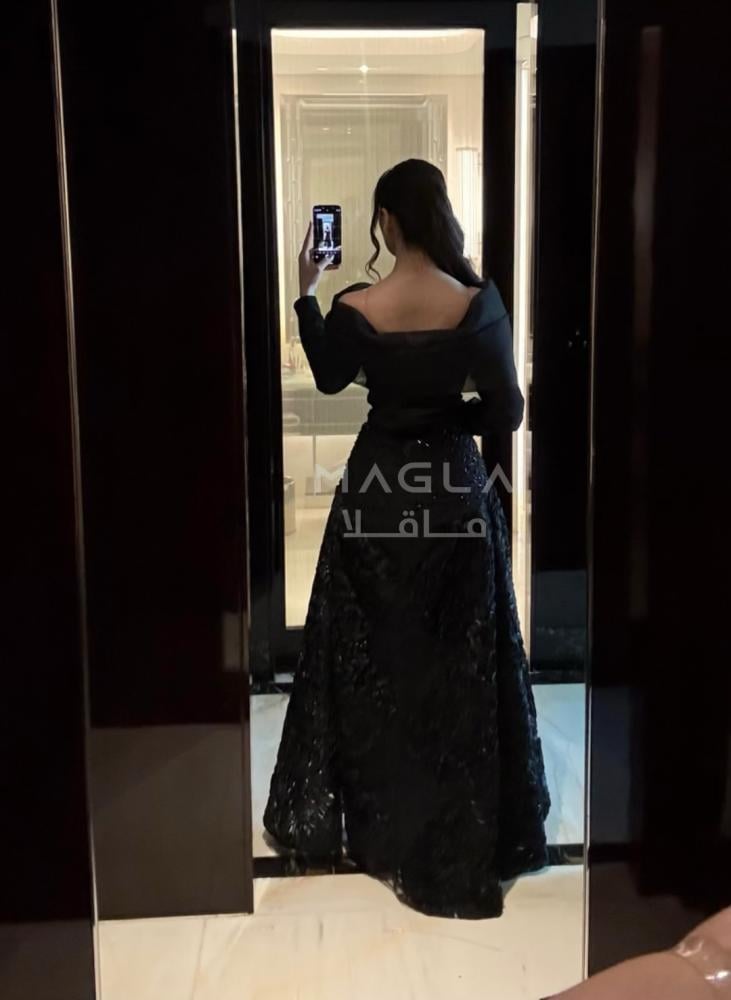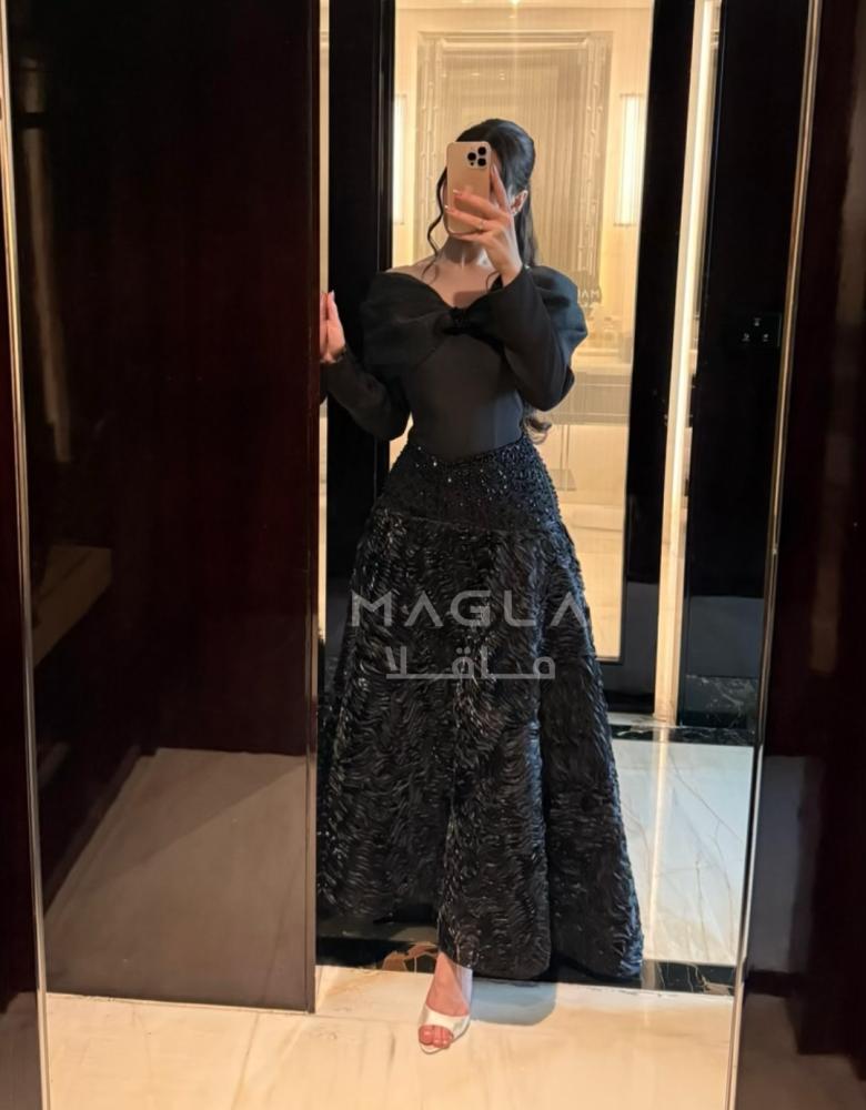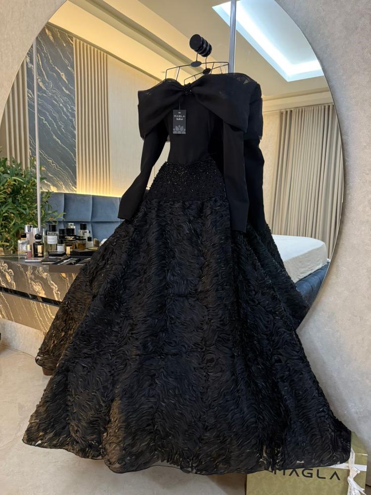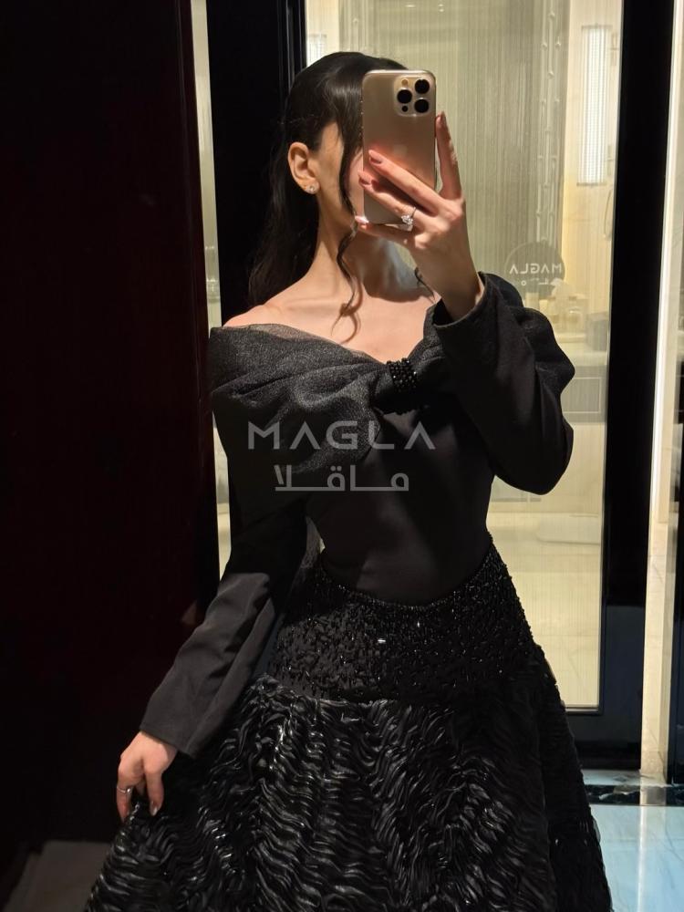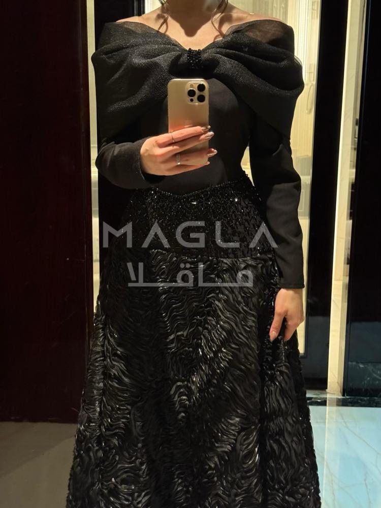 فستان سهره فاخر بقصّة أوف شولدر كلوش بأكمام طويلة، مصنوع من مزيج راقٍ من أورجنزا على باربي، مطرّز يدويًا بخرز لامع وشك أنيق. يتميز بتنورة كرنكل مموج كلوش مدعّمة بجيبون تركي تضيف فخامة للحضور.