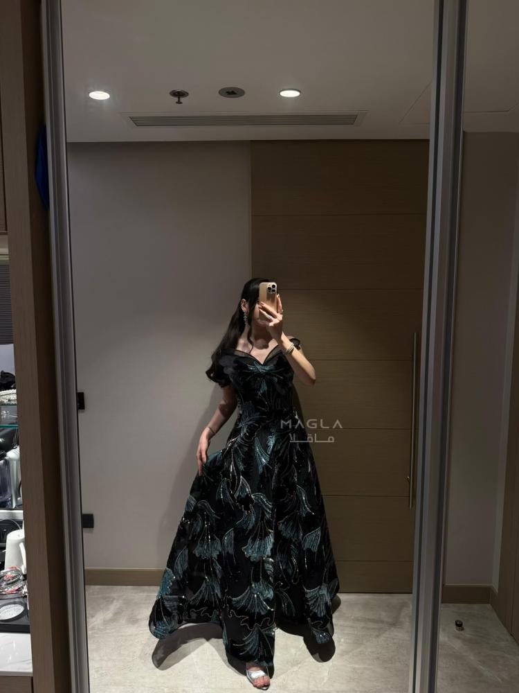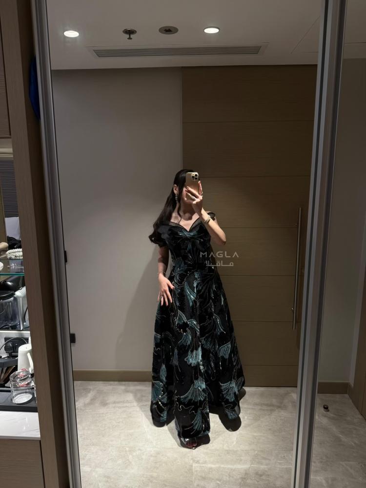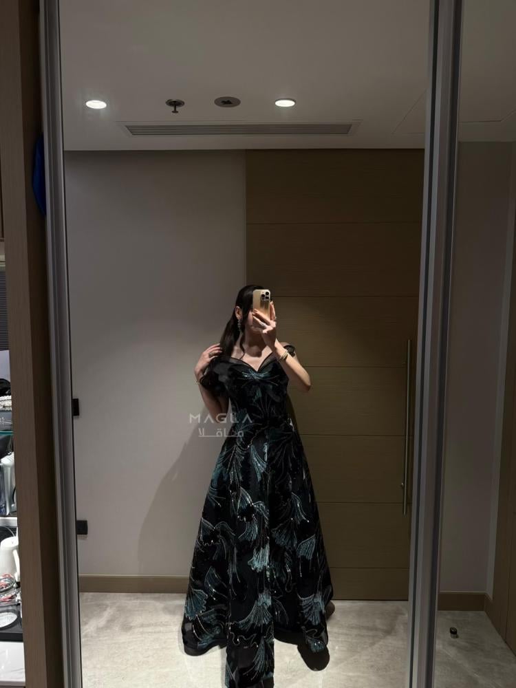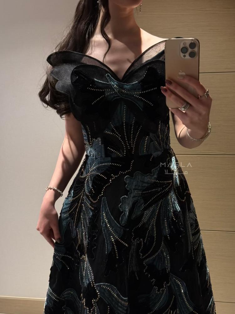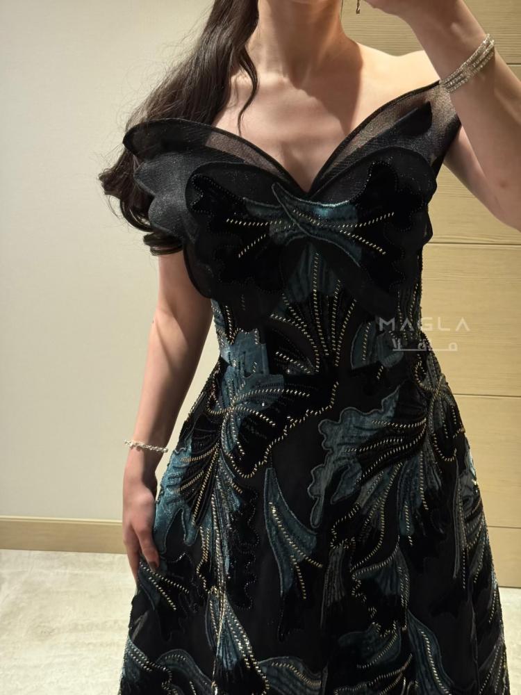 فستان سهرة فاخر من تل ناعم بتدخيلة قطفه مخمل فاخرة تمنحه لمسة غنية ومترفة.