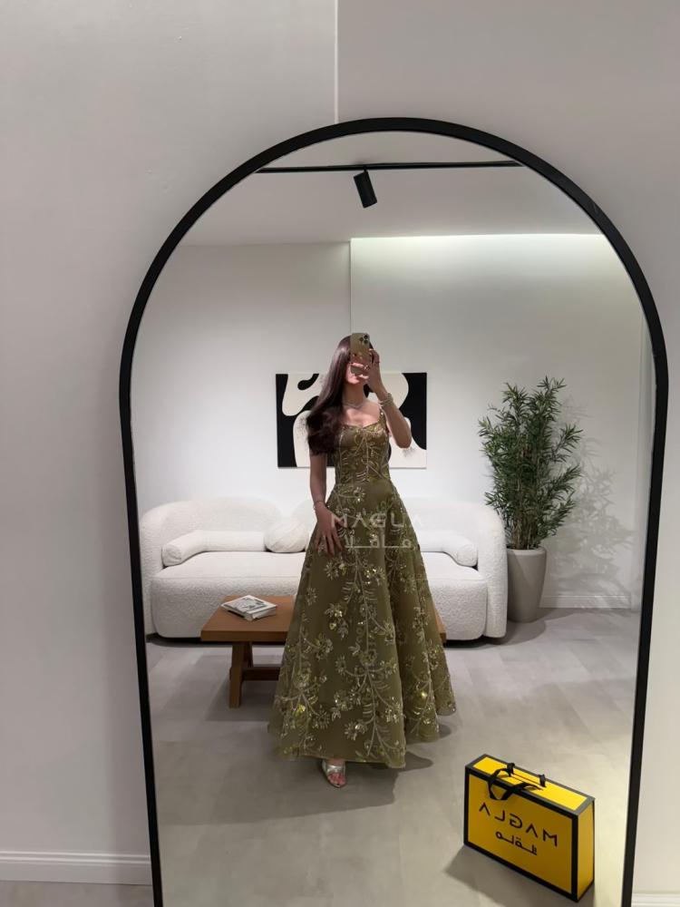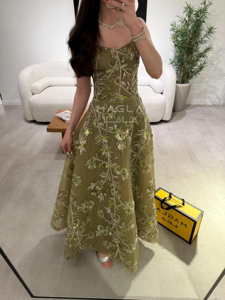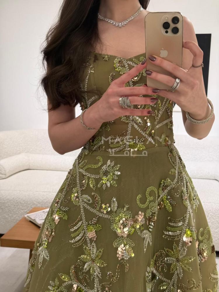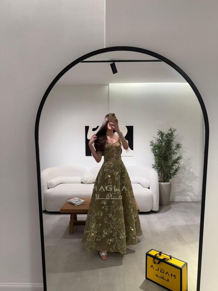 يأتي باللون الزيتوني الساحر بطول ١٦٠ سم وتصميم كت دبل كلوش يضفي انسيابية فخمة على الإطلالة.