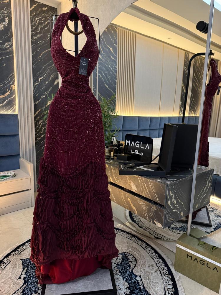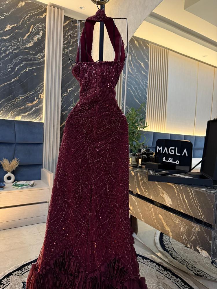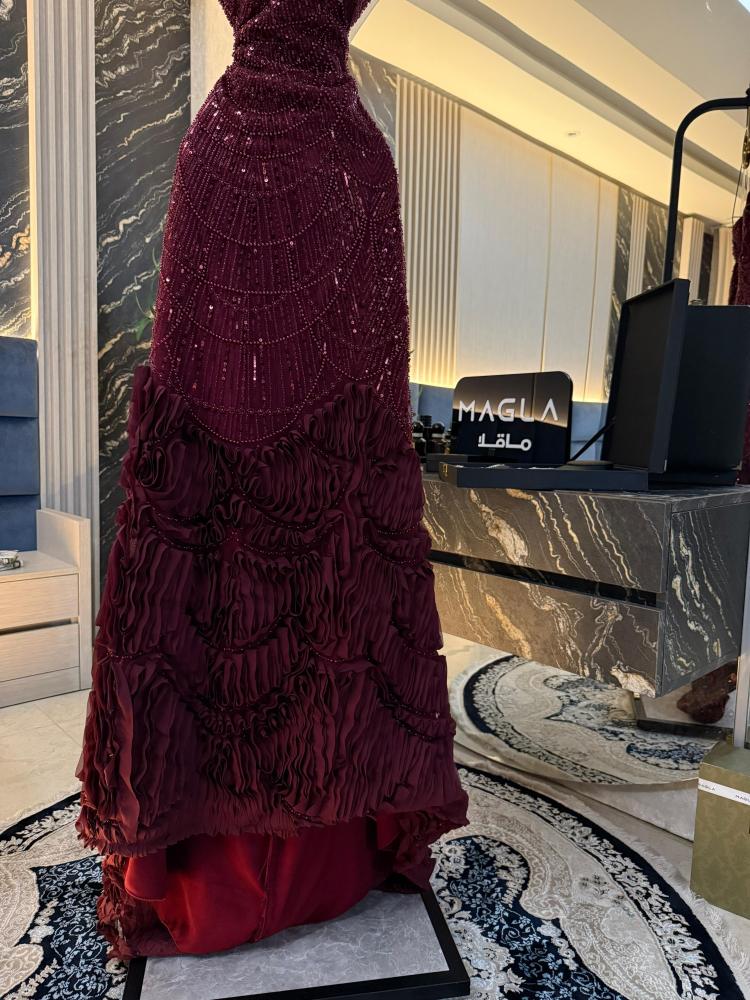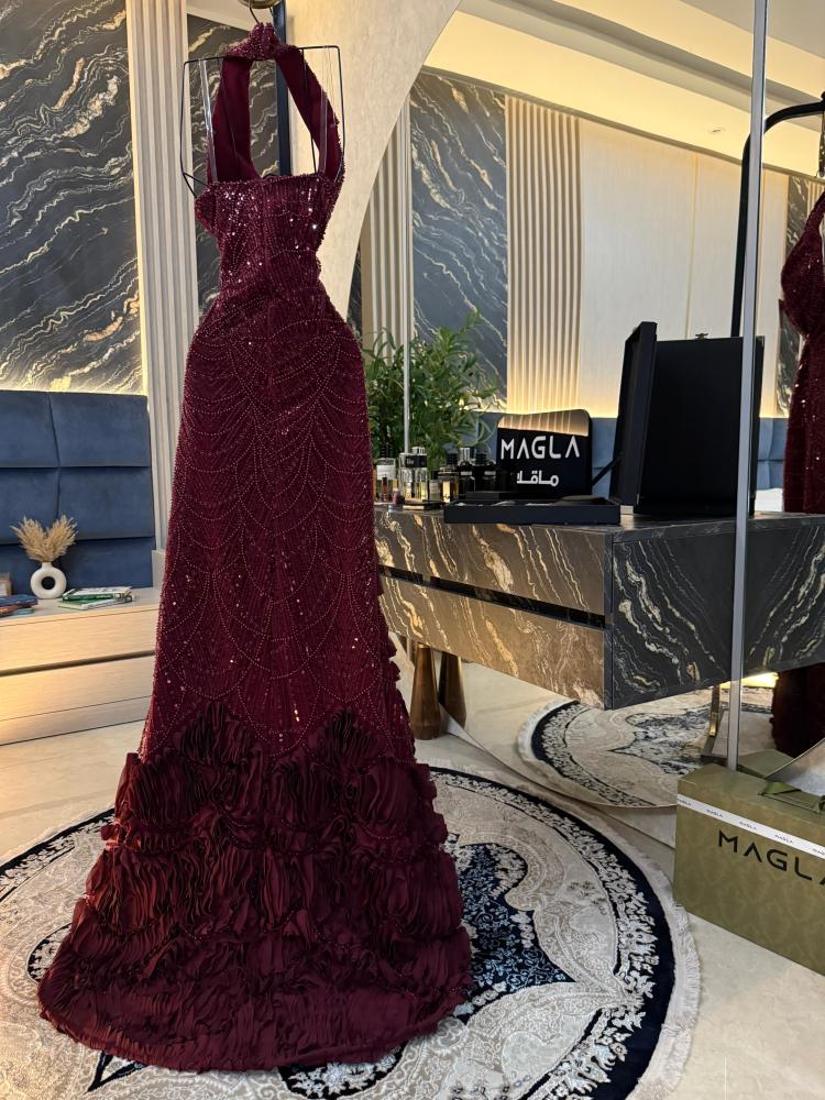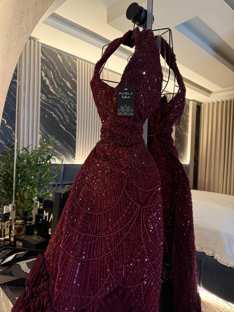 فستان ساحر بلونه البرغندي ينساب برقي بتصميم سمكة بذيل طويل يمنح إطلالة فخمة. مصنوع من تل ناعم على شيفون، مطرّز يدويًا بـخرز شك فاخر، مع بطانة باربي تضيف امتلاء وأناقة.