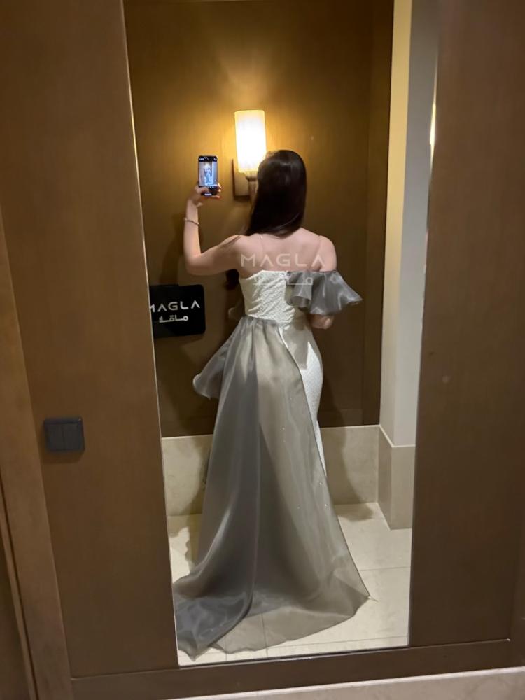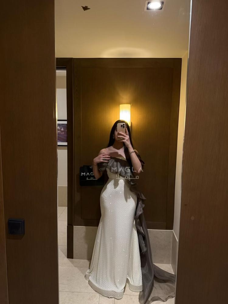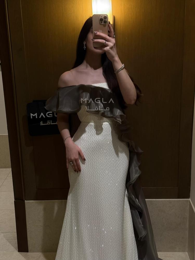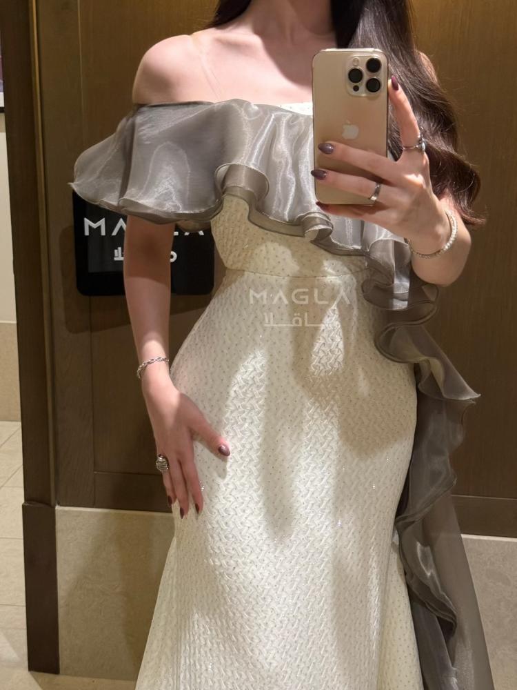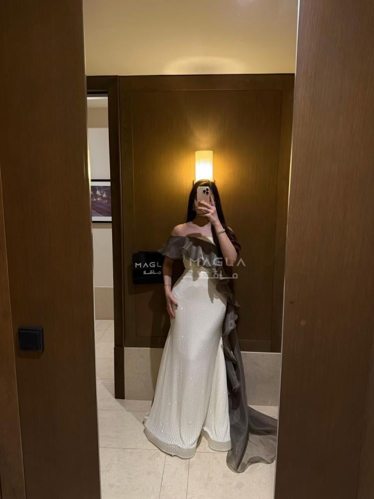إطلالة راقية تجمع بين النعومة والفخامة من كريب استرتش فاخر بتطريز فصوص ليزر لامعة تضيف بريقاً ساحراً، مع تدخيلة أورجنزا حرير تمنح الفستان لمسة انسيابية ناعمة.