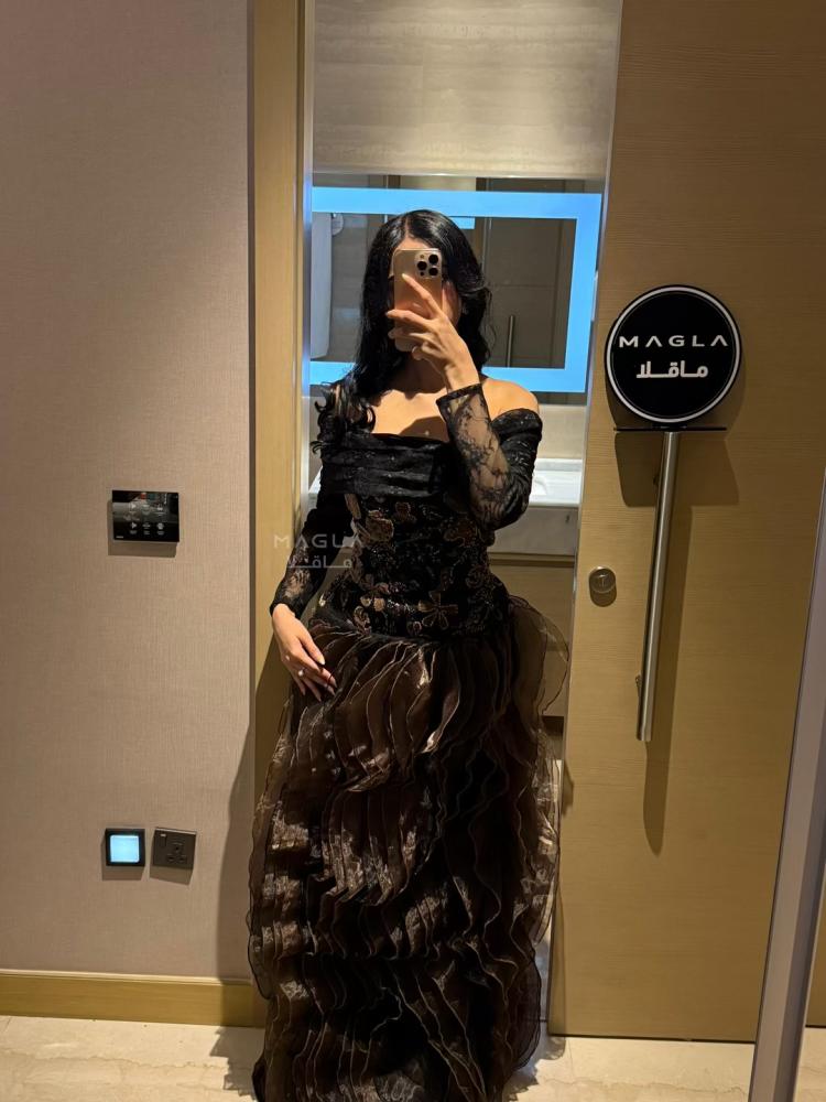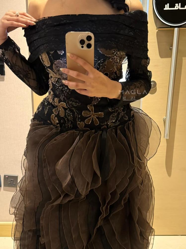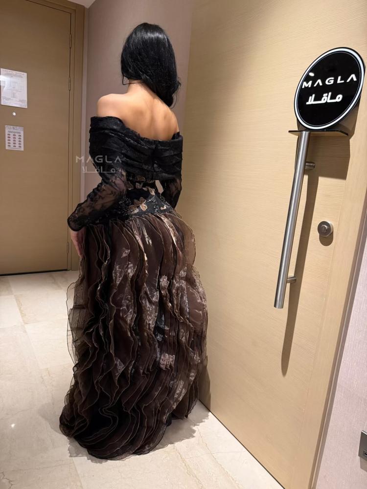 فستان سهرة راقٍ من دانتيل مطرز خرز شك يدوي بتفاصيل فنية أنيقة، تتناغم مع تدخيلة جازار كلوش بطبقات تمنحه فخامة وانسيابية لافتة.