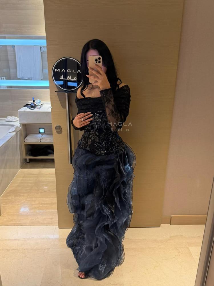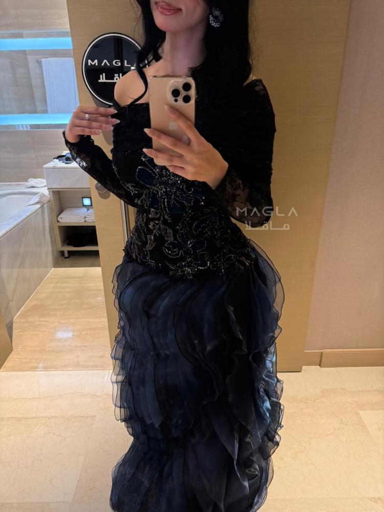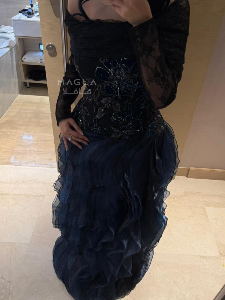 فستان سهرة فاخر من دانتيل مطرز خرز شك يدوي بتفاصيل دقيقة ولمسات راقية، مع تدخيلة جازار كلوش بطبقات تمنحه فخامة وانسيابية أنثوية.