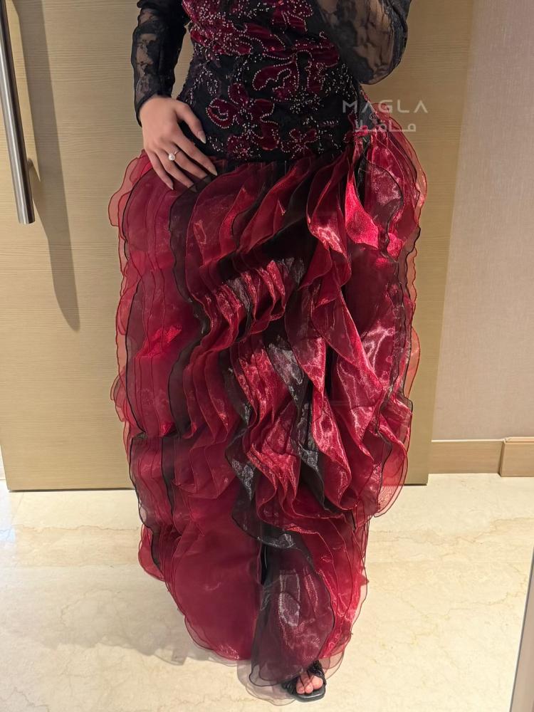 فستان سهرة فخم من دانتيل مطرز خرز شك يدوي بتفاصيل راقية، ينسدل بأناقة مع تدخيلة جازار كلوش بطبقات تمنحه حجماً فخماً وحركة انسيابية آسرة.