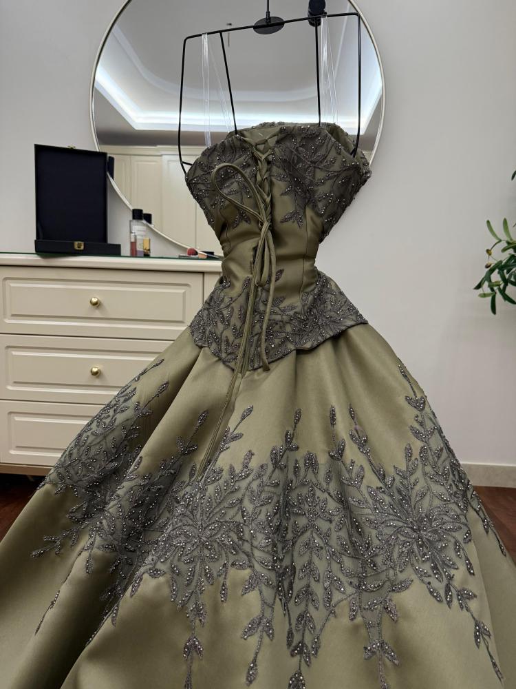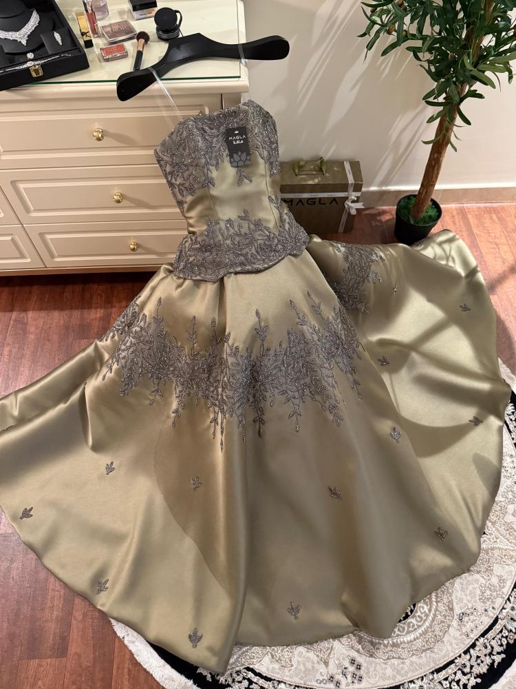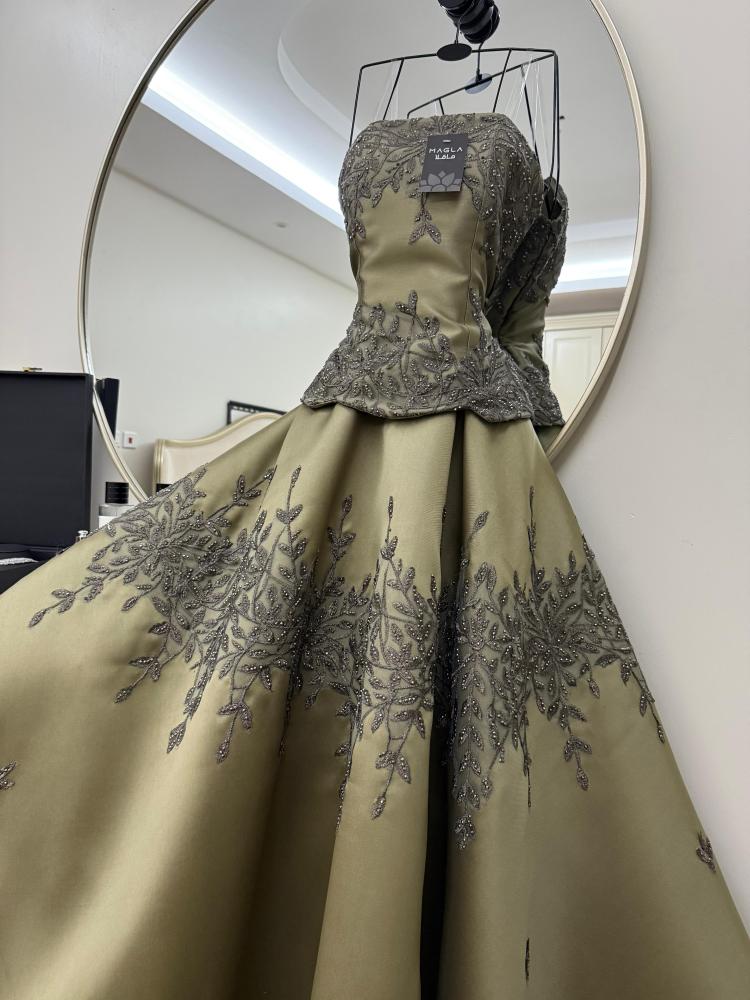 فستان لورين مصنوع من خامة ميكادو فاخرة، مزدان بتطريز كمبيوتر دقيق ولمسات فصوص ليزر براقة تضيف له طابعًا عصريًا راقٍ.