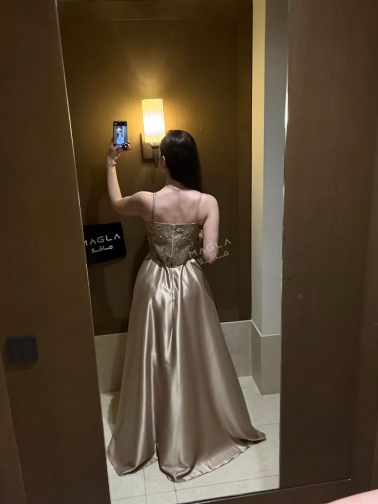التصميم توب علاقي يبرز الأكتاف والرقبة بأسلوب أنثوي جذاب، مع كسرات عند الخصر تعزز جمال القوام، وذيل طويل يمنح الفستان حضورًا ملكيًا أنيقًا.