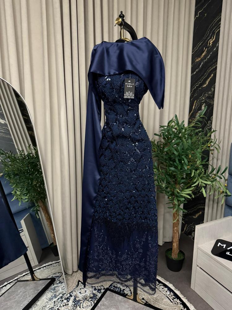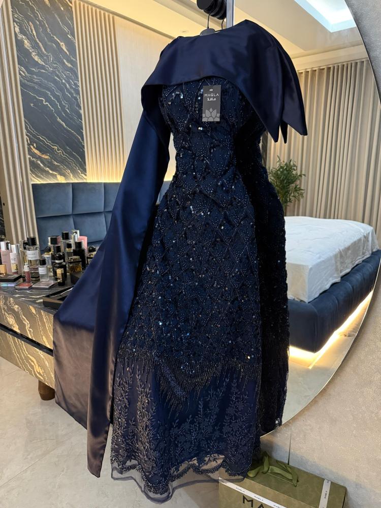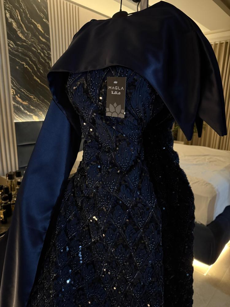 فستان كحلي أنيق من التل المطرز بالخرز الراقي على شيفون ناعم، ينساب بجمال مع وشاح فاخر من التفته الأمريكي وتفته الحرير ليمنحك حضورًا آسرًا. الطول 156 سم، والسعر 495 ريال