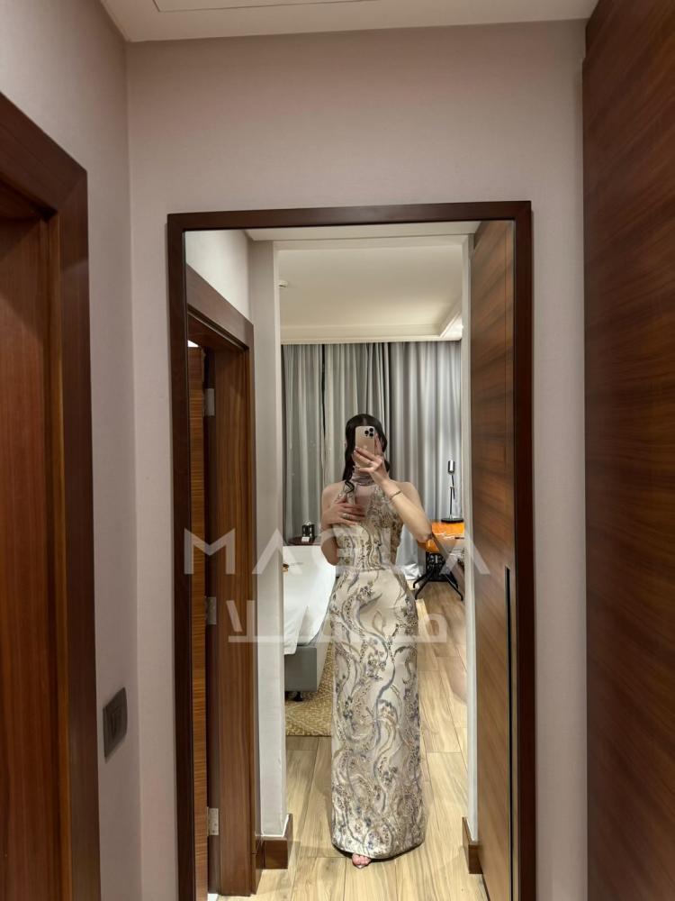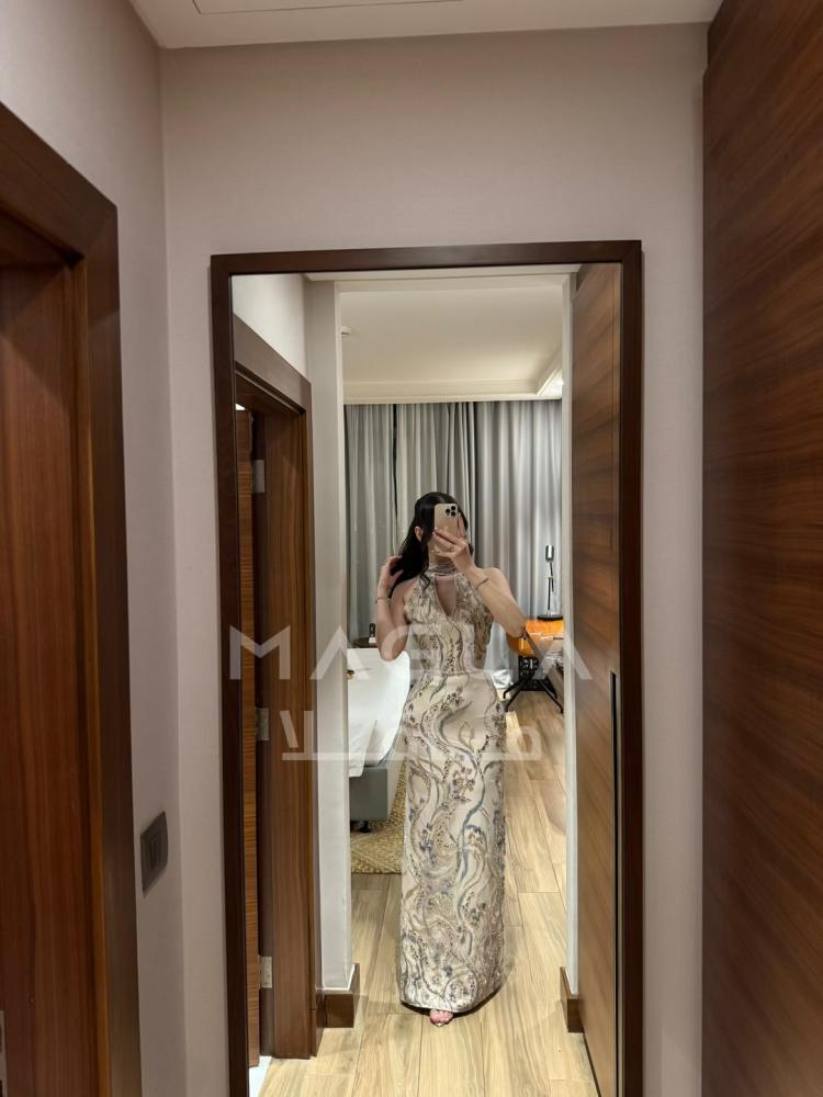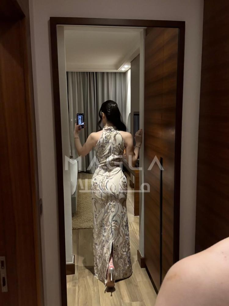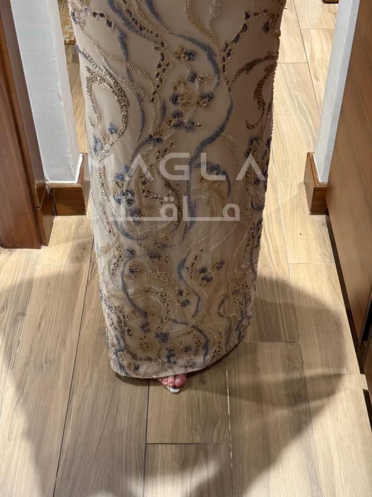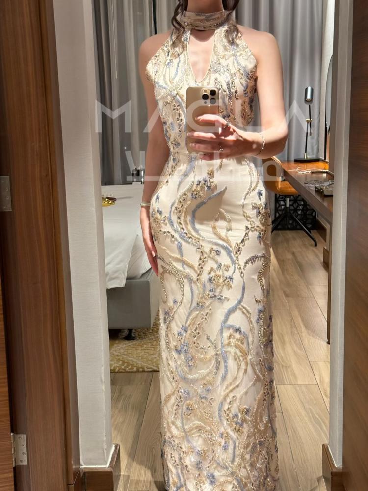 فستان سهرة أنيق من تل فاخر بتطريز شك يدوي متقن مع بطانة تفته تمنحه ثباتًا وانسيابية راقية. يتميز بقصة سكيني خناقي تمنحك مظهرًا أنثويًا جذابًا.