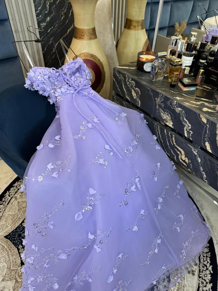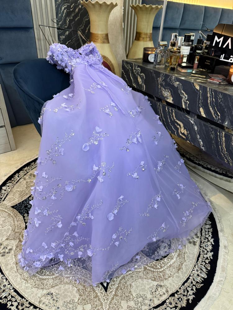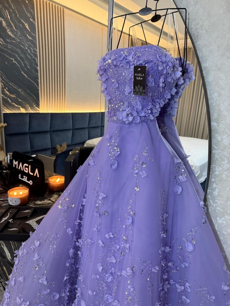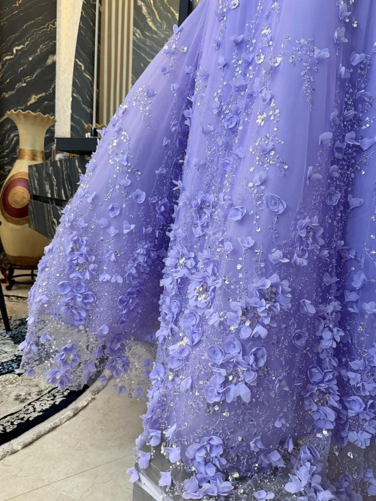 فستان سهرة فاخر بتصميم دبل كلوش واسع، مصنوع من تل مطرّز بالخرز بتفاصيل جذابة، مع ورود بارزة تضيف فخامة ببريق الترتر اللامع.