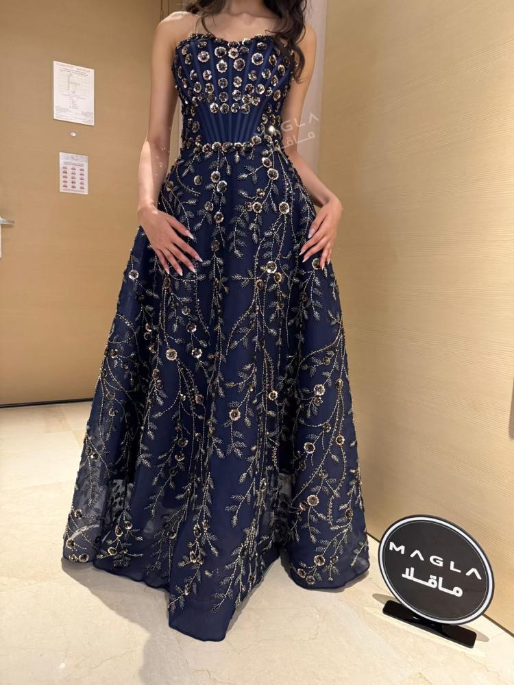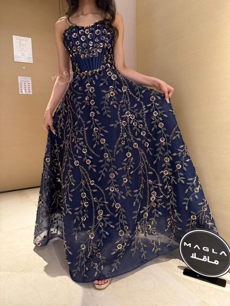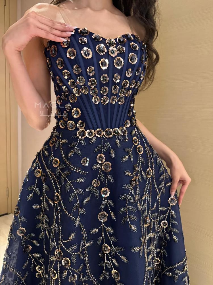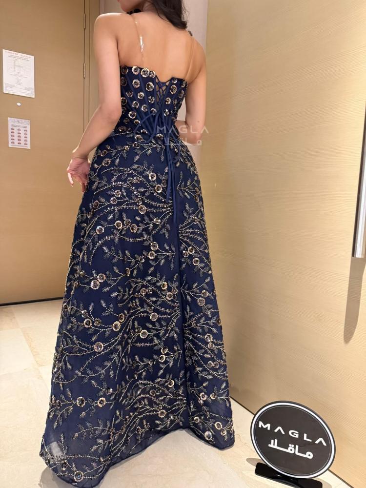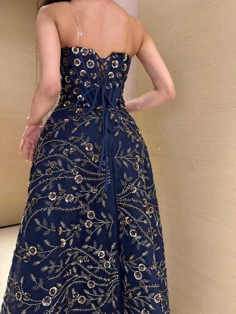 يتميز بتصميم كورسيه فرنسي واقف يمنح قواماً أنثوياً ممشوقاً وإطلالة ملكية آسرة.