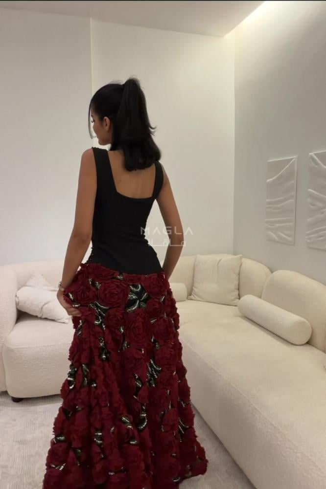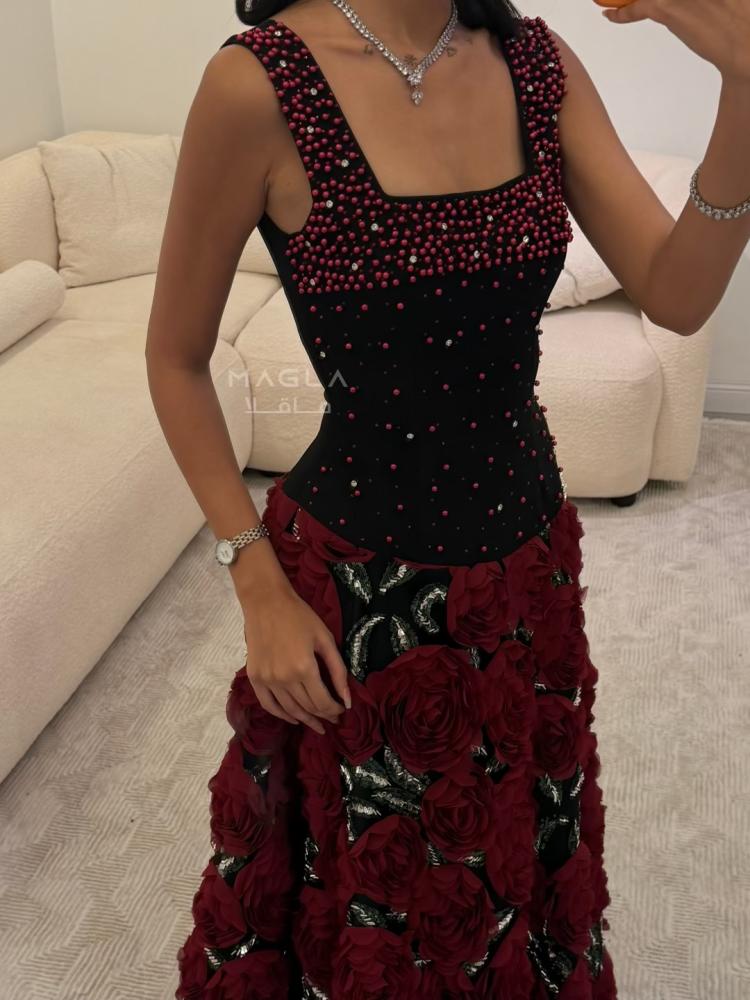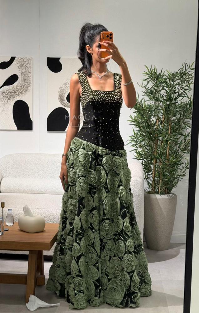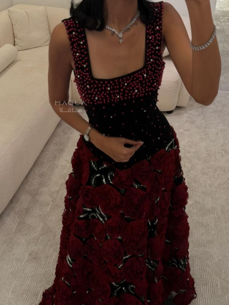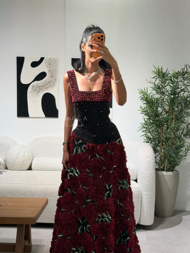 يأتي بصدر من قماش الباربي المطرز باللؤلؤ ليمنح لمسة أنثوية ناعمة، وتنورة كلوش فخمة مزينة بورود مطرزة بالخرز والترتر تتلألأ مع كل حركة بانسيابية ساحرة.